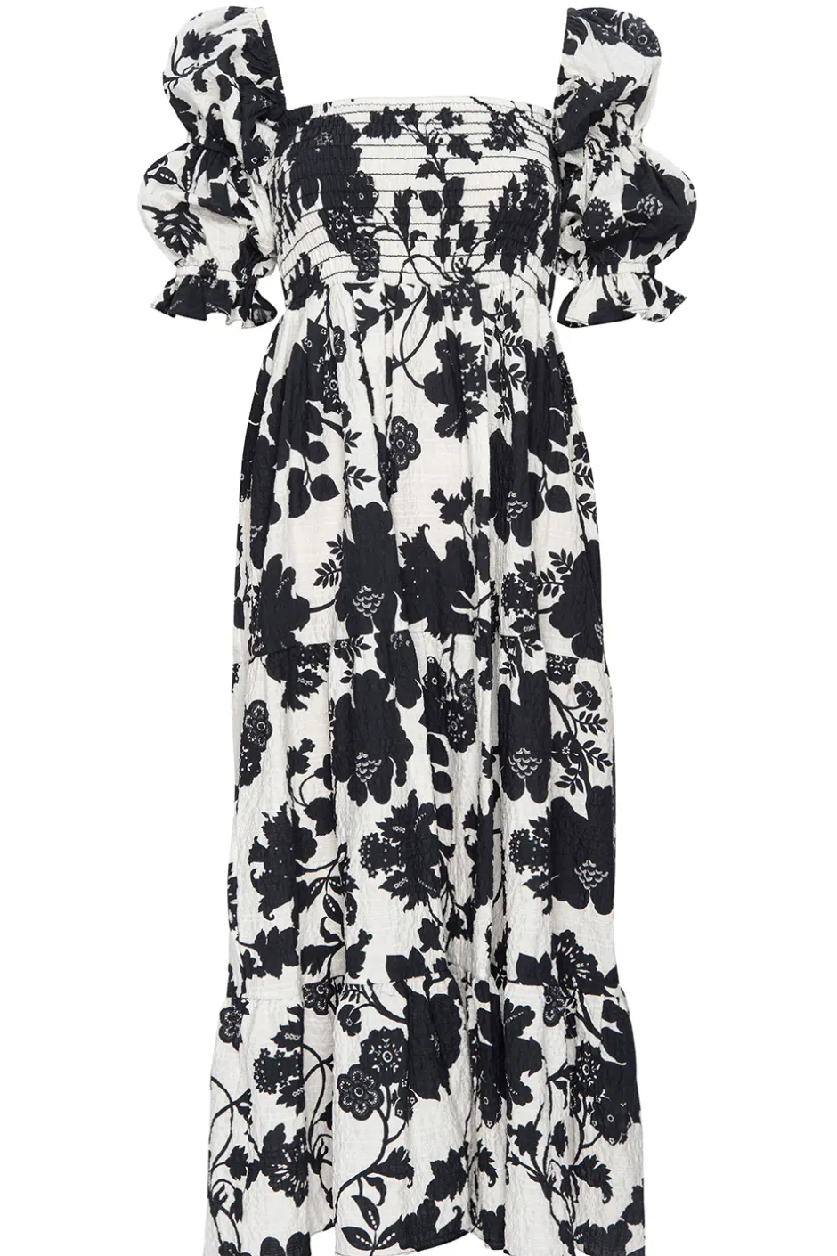Our Margarita midi dress is a style you will turn to for seasons to come. Cut from a chic stretch crinkle cotton, this monochromatic floral print style can be worn on or off the shoulder. Featuring short tiered puff sleeves and a smocked bodice with tiered skirt and double side slit pockets. This flattering fit and flare silhouette can be dressed up with strappy heels or down with flats.