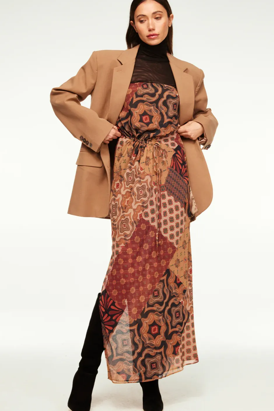 Mariah is a stunning and versatile new strapless maxi dress cut from our Surreal Patchwork chiffon. An adjustable cinch tie detail at the waist allows you to customize the fit. Side slit. Double lined with hidden side zip closure. We love a 90’s inspired layered look with our mesh Nadja or Lula tops underneath or with an oversized blazer and suede boots.
