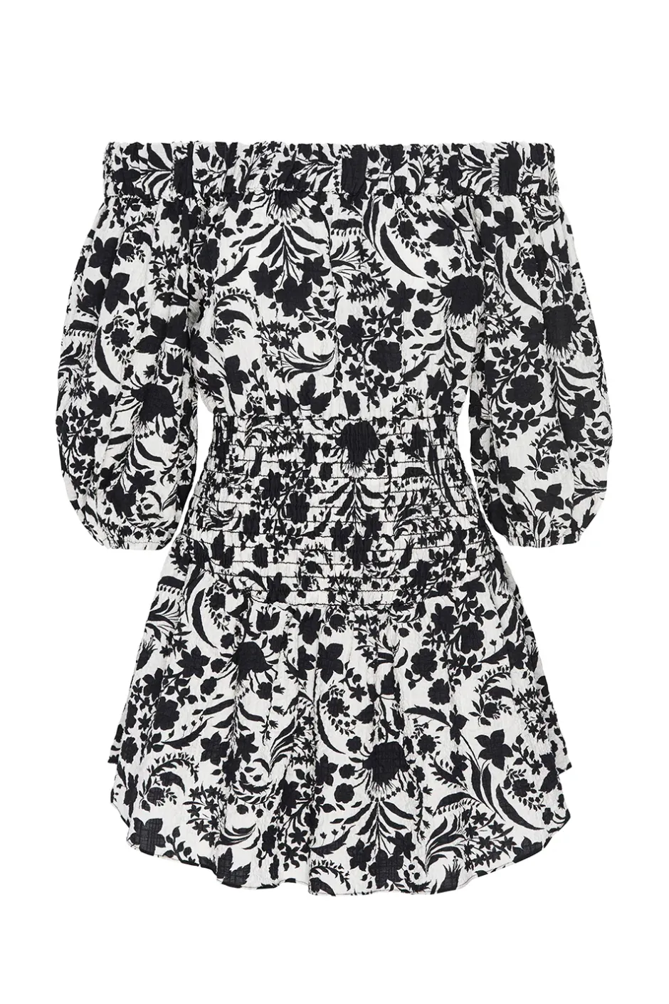 Marta is an update to a signature MISA mini style. Cut from a monochromatic ditsy floral print stretch crinkle cotton, this easy style features an off-the-shoulder neckline and blouson short sleeves. A blousy bodice leads into a wide, smocked waist and curved hem skirt. This timeless style will carry you through this season into the next.