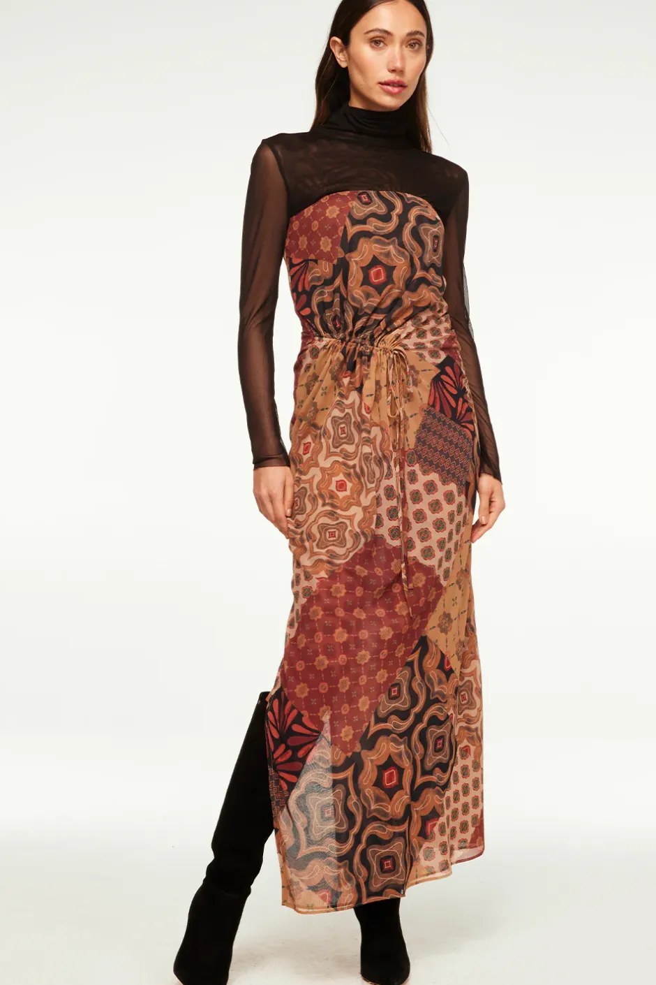 Our newest black mesh Nadja top is the perfect layering piece for fall and beyond. This fitted stretch turtleneck is double lined at the body and features long sheer sleeves. Sheer allover. Pair under our new Mariah dress or Cheryl dress or wear on its own with jeans.