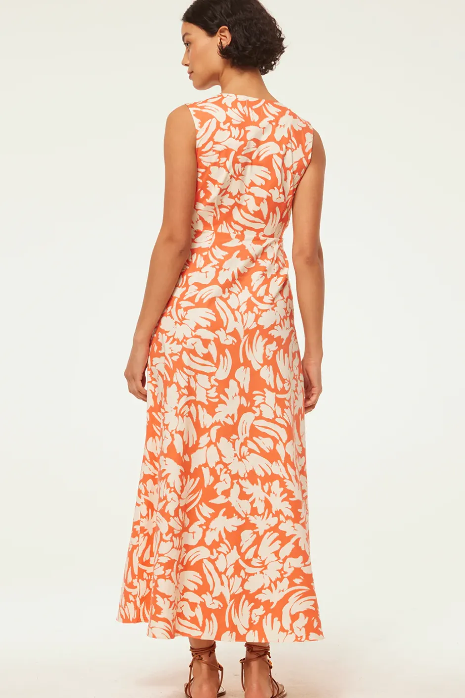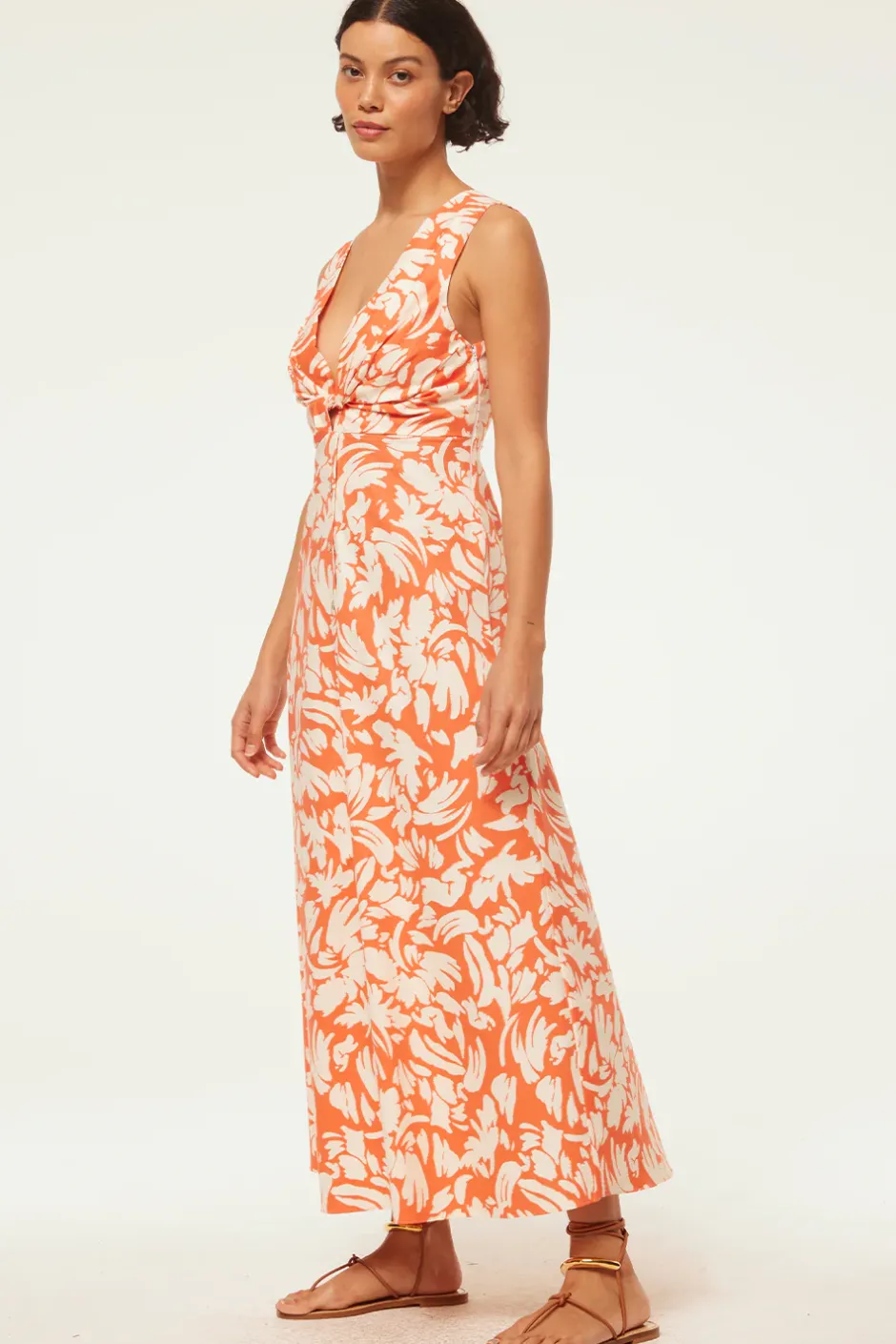 Our new Najah maxi dress is a gorgeous addition to your warm-weather wardrobe, cut from a crisp cotton poplin in a vibrant Patmos Tangerine print. This figure-flattering sleeveless silhouette features a v-neckline and twist front detail with a hidden side zip closure. Pair with flats for a chic daytime look or dress up with heels.