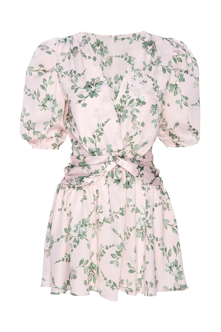 Our best-selling Narcissa is back for Spring in a beautiful sage botanica print on a warm ivory satin ground. This figure-flattering mini is perfect for day to date nights and all your special celebrations depending on what you style it with. Featuring a gathered waist, deep v neck with a snap closure, elbow-length puff sleeves, and a hidden back zipper closure.