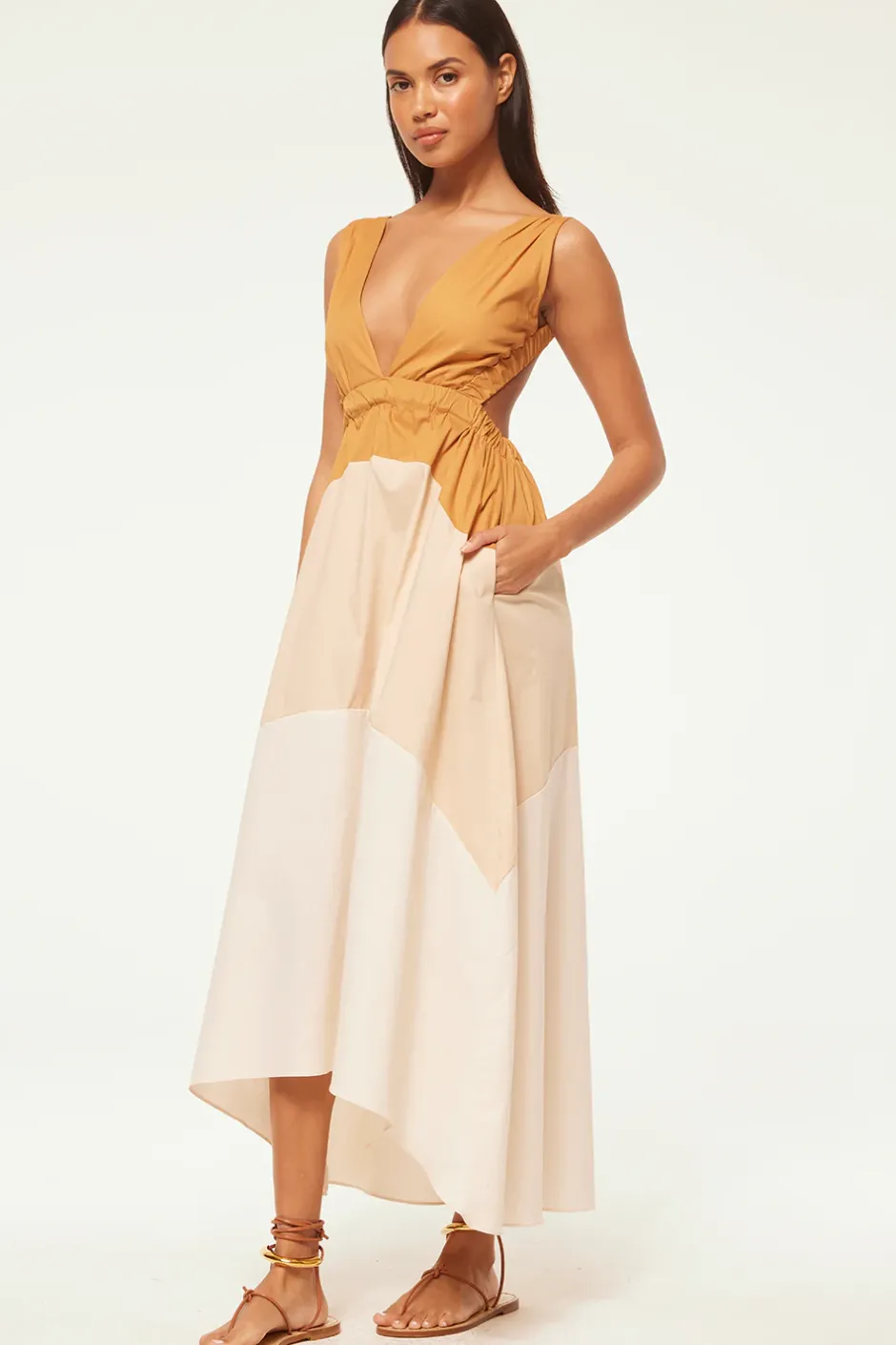 Our new Nia dress is a summer staple in gorgeous tonal color blocked cotton poplin. This sleeveless silhouette features double side slit pockets, a deep v neckline and an open back that leads into a flowing ankle-grazing skirt with a slight high-low hem. We will be turning to this chic and timeless silhouette for years to come.