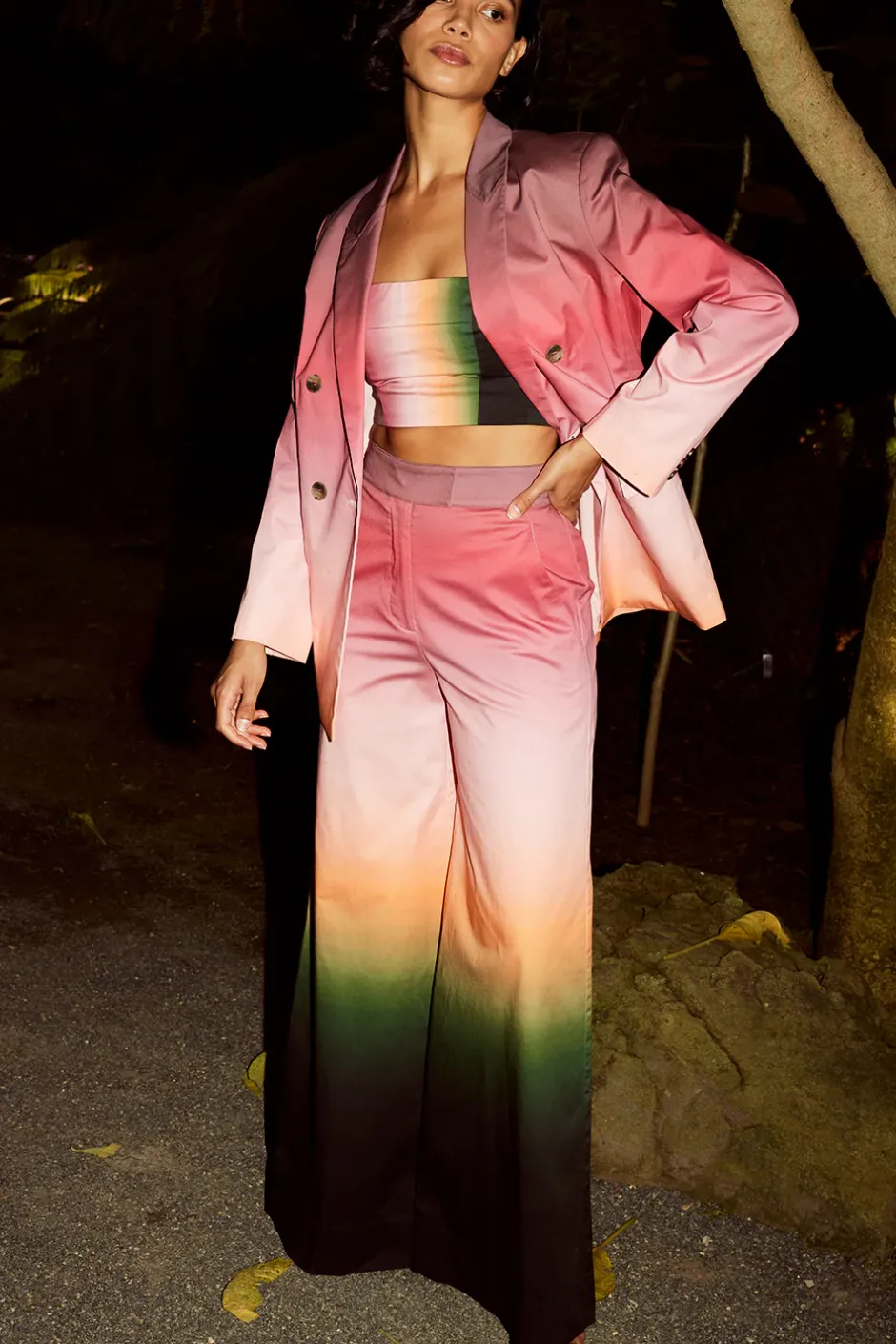 Our high-rise Nico pant is a standout look cut from a bold ombre print cotton. Featuring exaggerated wide legs and side slant pockets. A hidden zip front and extended hook-and-bar closure. Pair with the coordinating Candy bandeau and Viva blazer for a fun twist on suiting.