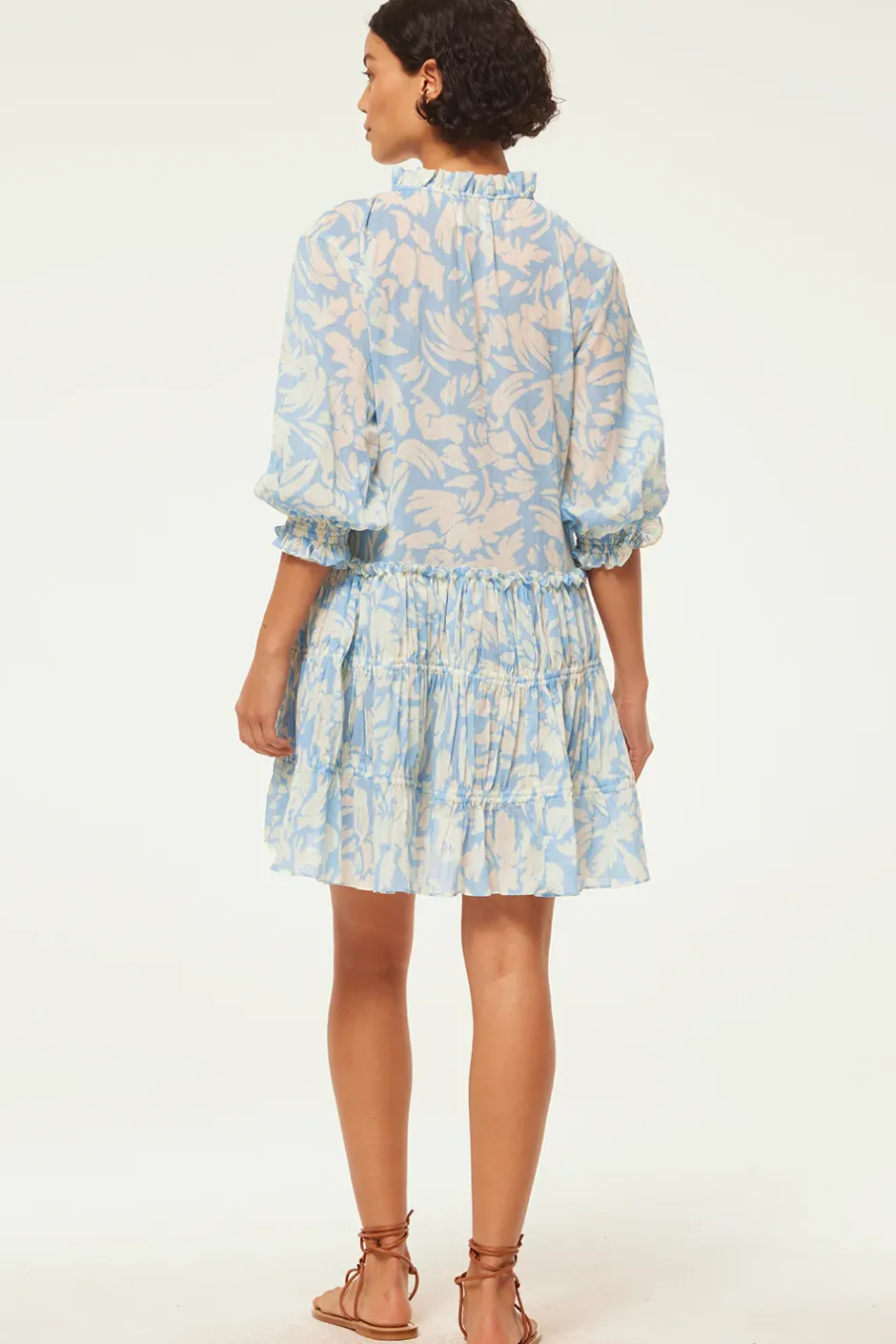 The Nita dress is the perfect effortless mini silhouette for this season and beyond. Handcrafted from a breezy Patmos Sky printed cotton, it features a split v-neckline with a delicate ruffle neck detail and our signature petal ties. Three-quarter sleeves are finished with ruffle-trimmed cuffs. This intentionally oversized weekday to getaway style is finished off with a ruched ruffle hem.