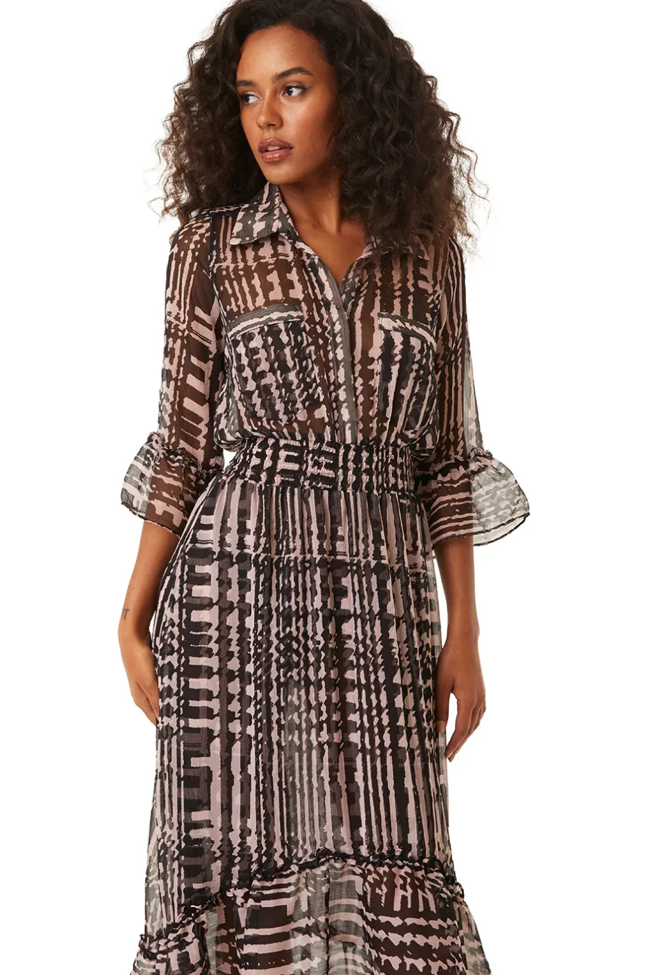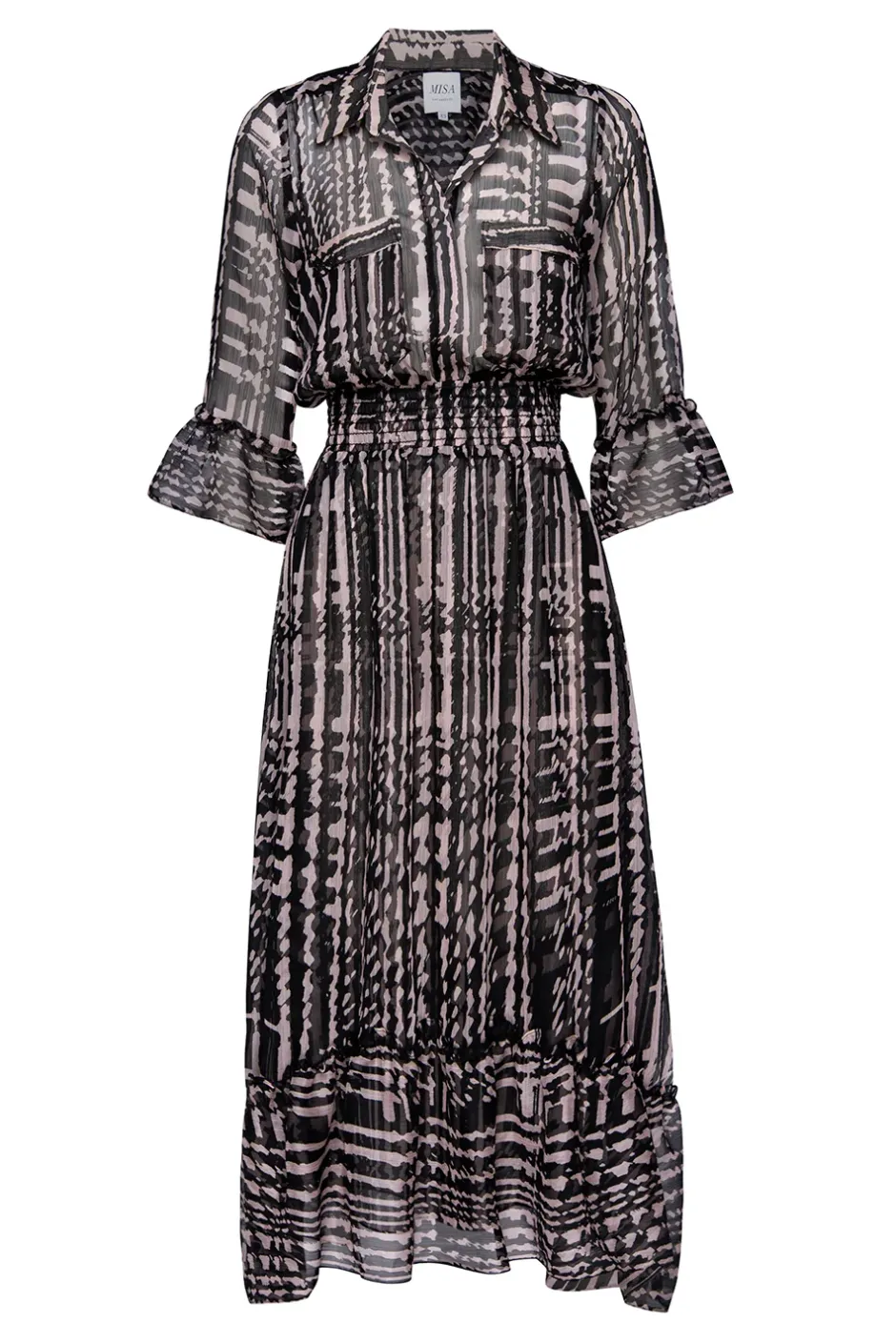 Our best-selling Ofelia shirt dress is back in a beautiful pale mauve and black abstract print chiffon. This versatile silhouette elegantly transforms from daytime to evening. Featuring an elastic waistband, double pockets at the chest, and loose ruffles on the three-quarter sleeves and a-line skirt.