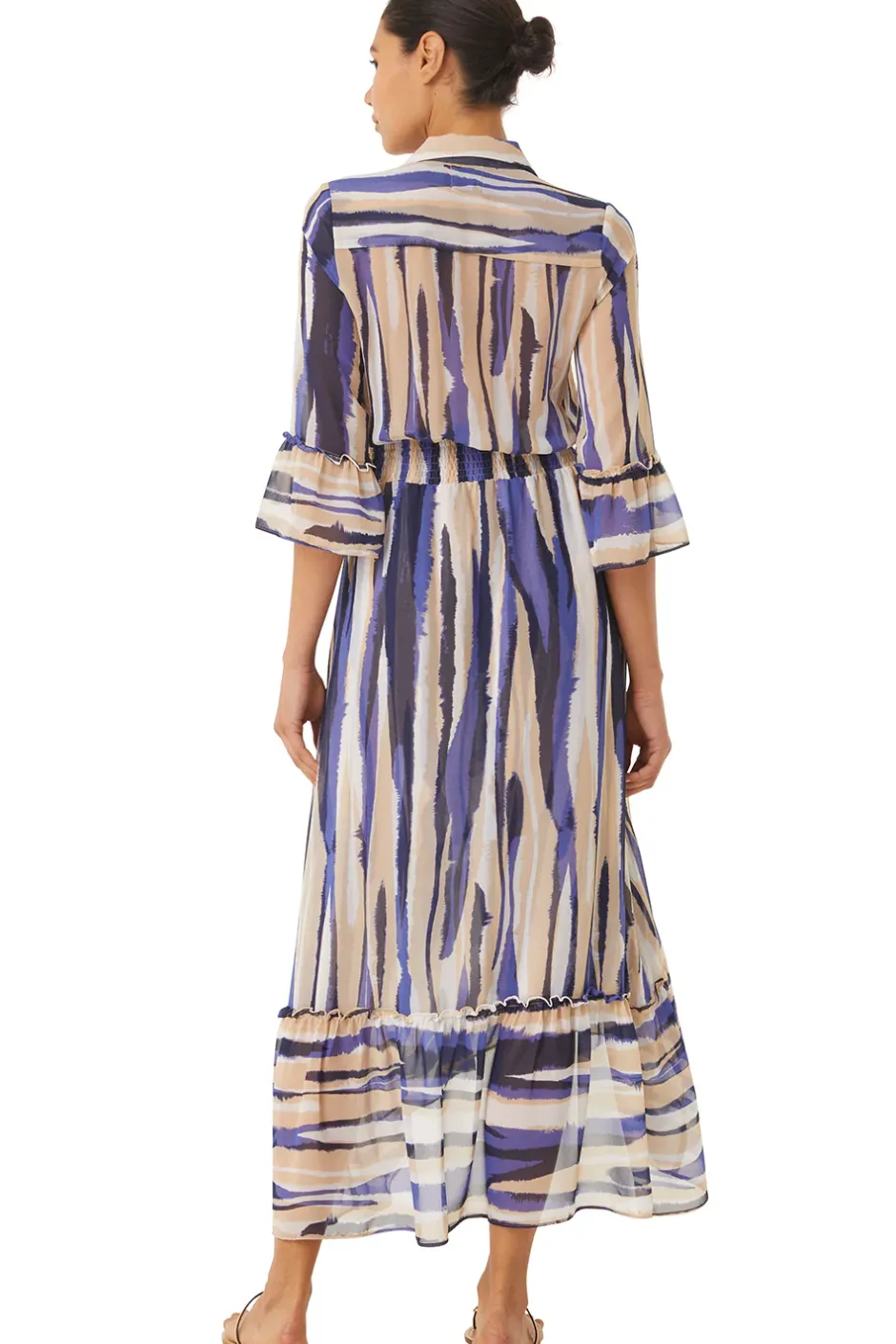 Our best-selling Ofelia midi shirt dress is back in a beautiful navy, blue and tan striped chiffon. This versatile silhouette elegantly transforms from daytime to evening. Featuring an elastic waistband, double pockets at the chest, and loose ruffles on the three-quarter sleeves and a-line skirt with wide ruffle hem.