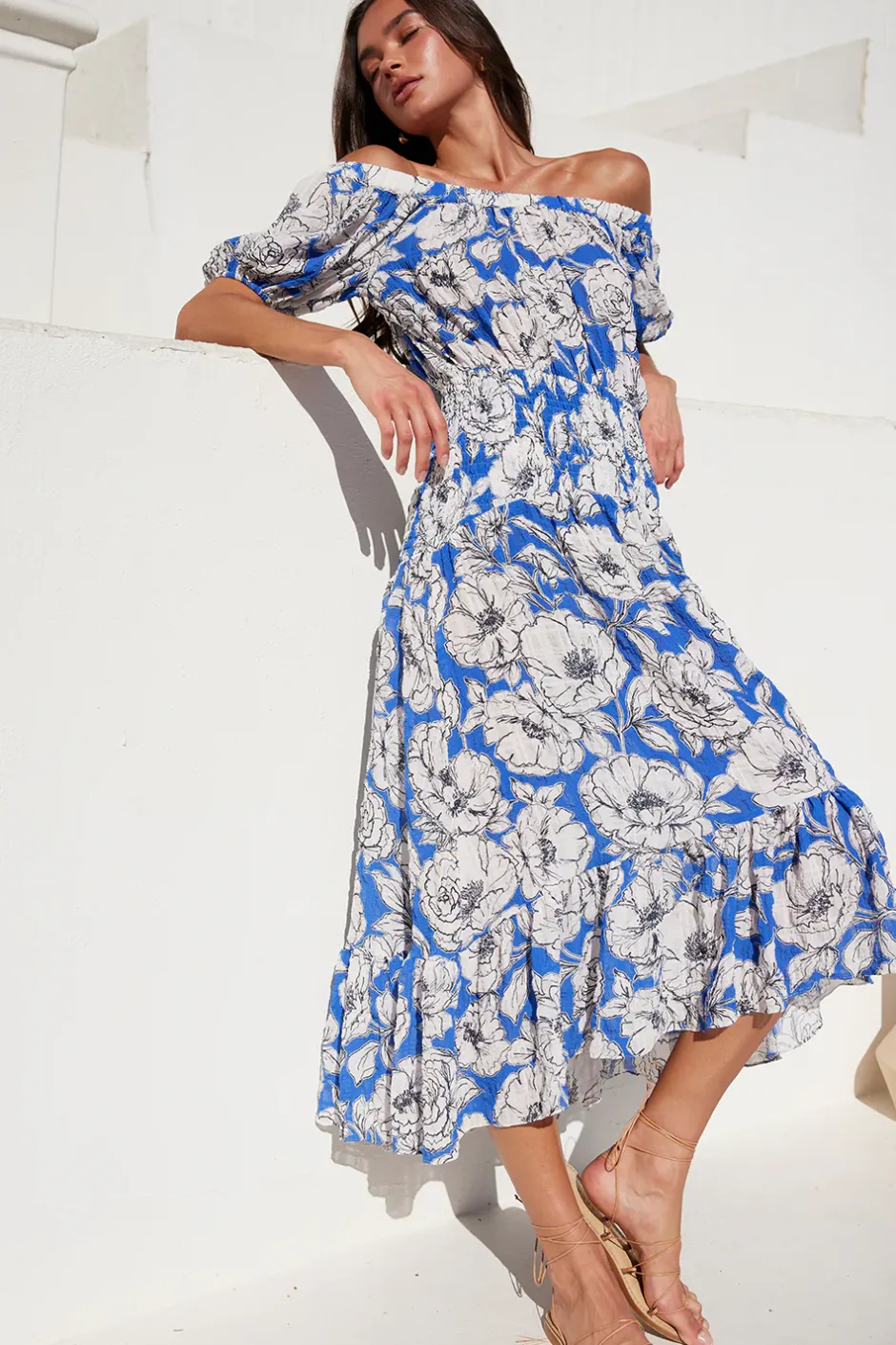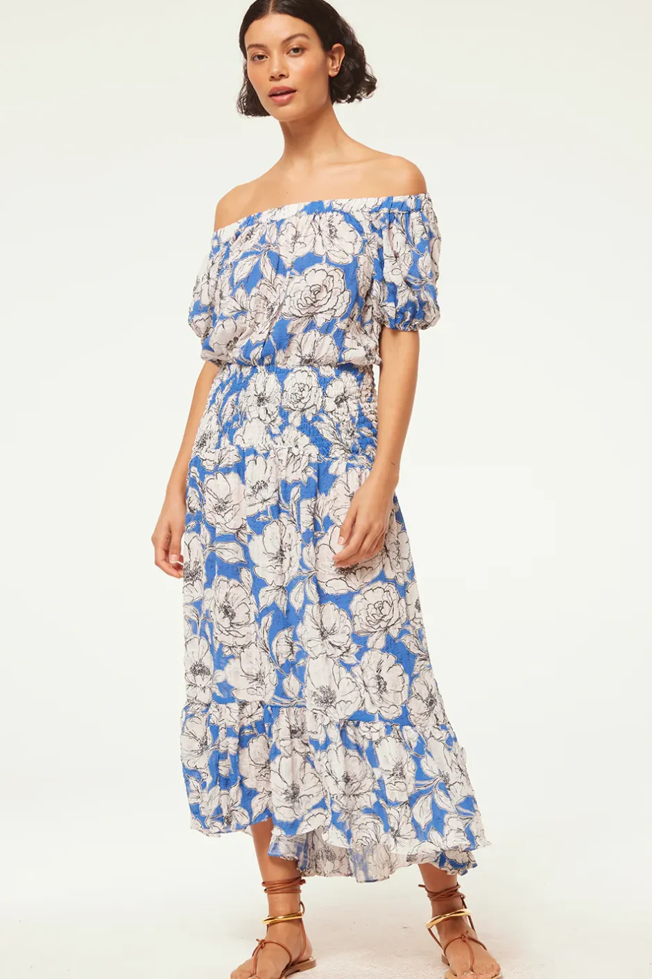 Paola is a chic off-the-shoulder midi in a gardenia floral crinkle fabrication. Defined by an elastic ruffle-trimmed neckline with an open back tie detail. A wide shirred elastic waistband leads into an asymmetric skirt with wide ruffle trim. A stunning style for every occasion this season and beyond…