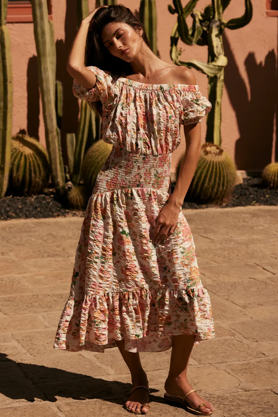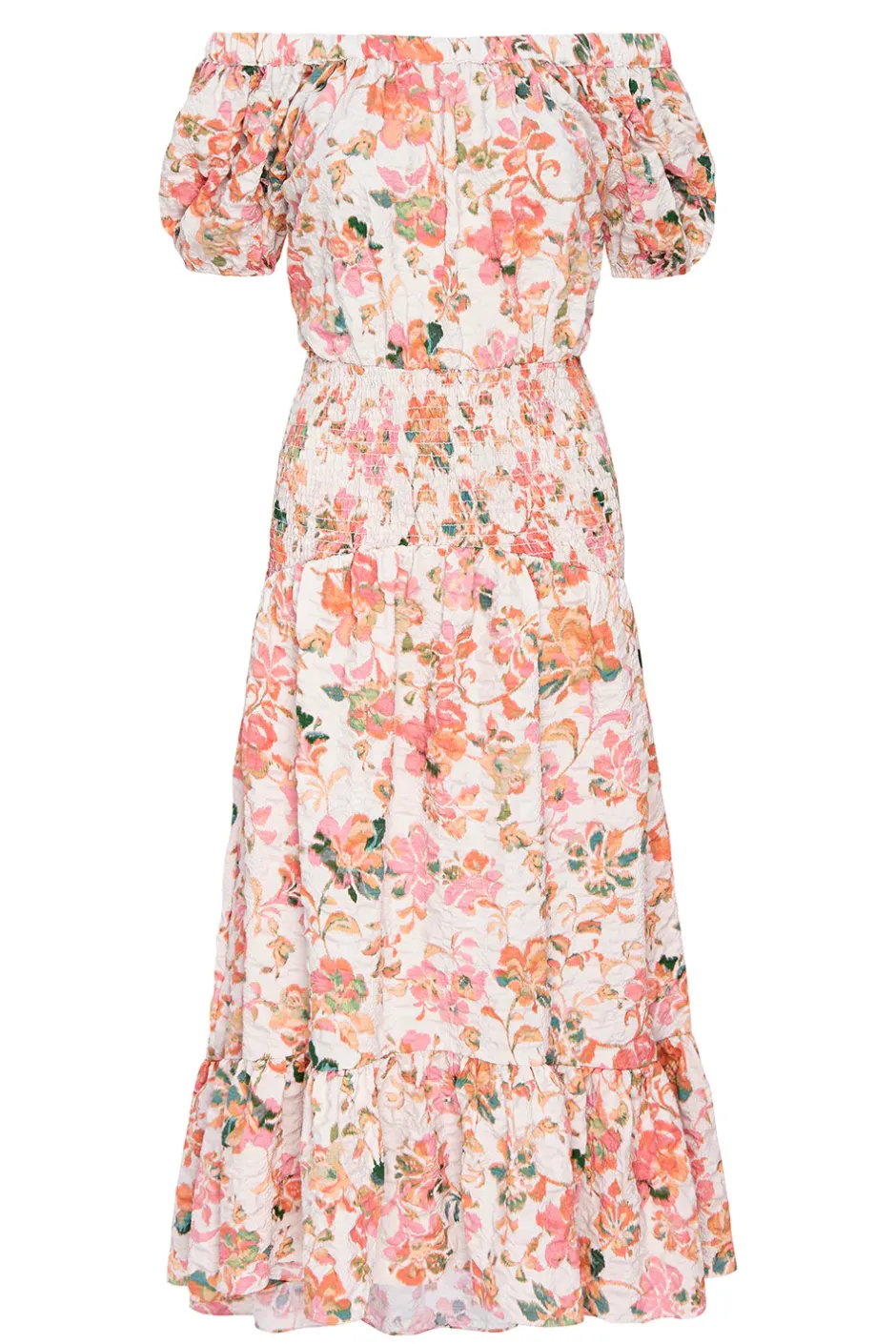 Paola is a chic off-the-shoulder midi in a persimmon floral crinkle fabrication. Defined by an elastic ruffle-trimmed neckline with an open back tie detail. A wide shirred elastic waistband leads into an asymmetric skirt with wide ruffle trim. A stunning style for every occasion this season and beyond…