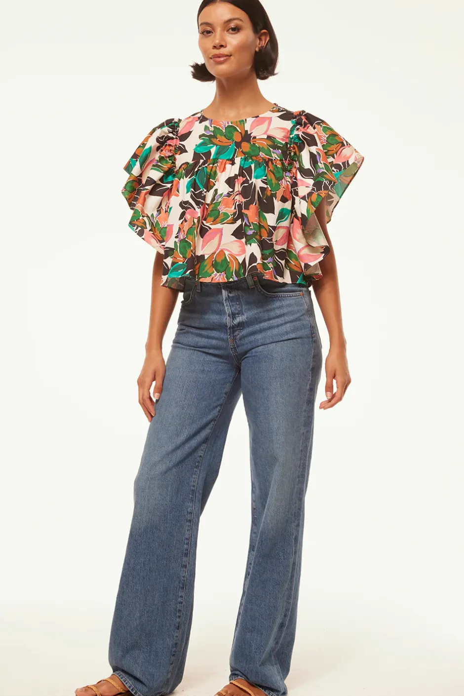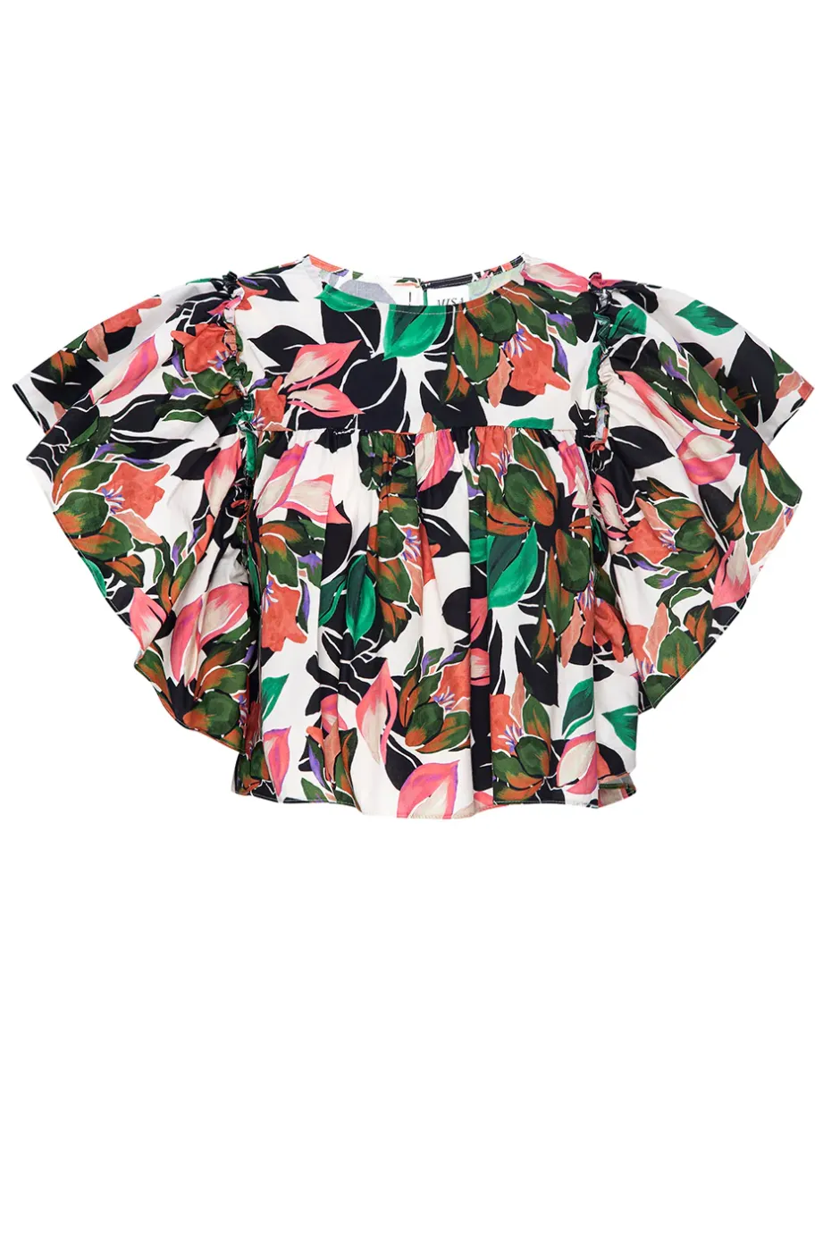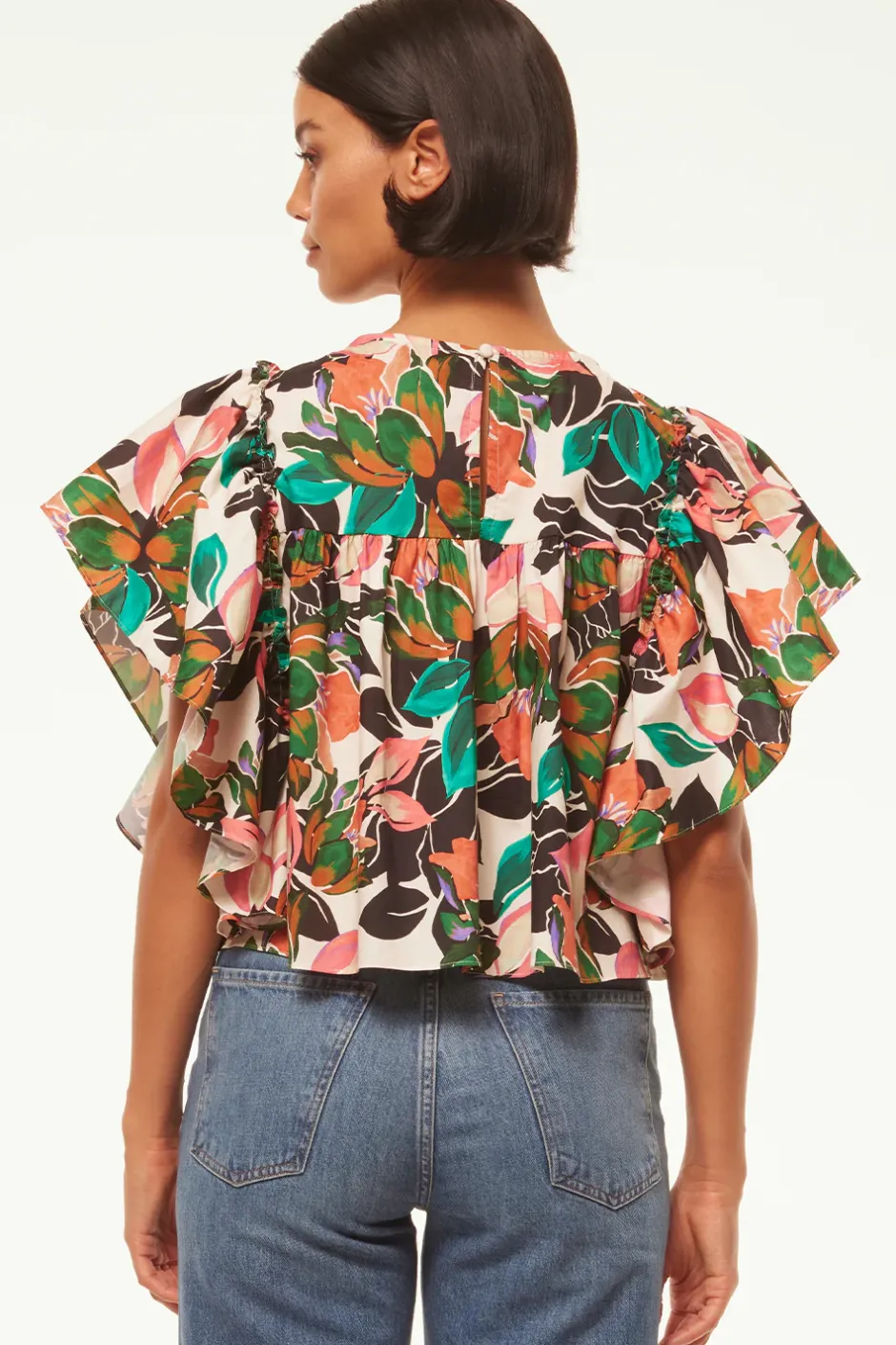 Penelope is an easy cropped blouse cut from a Las Palmas tropical printed cotton poplin. Featuring a high neckline and pleated above the bust. Short wide ruffle sleeves and a back hook closure finish off this easy style that will carry you through this season into the next.