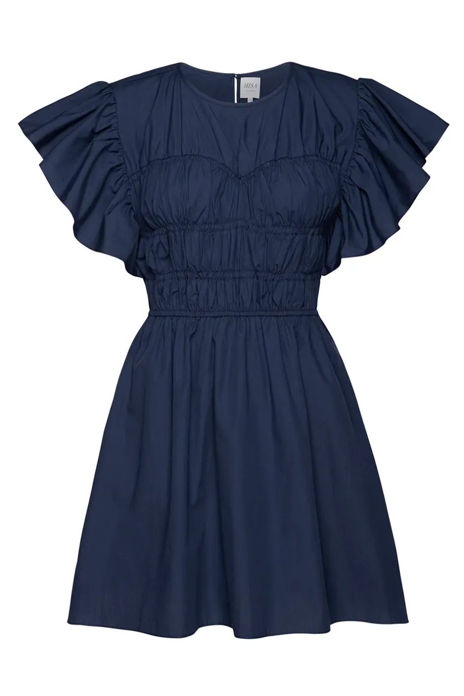 Our new Radha is an unforgettable cotton poplin mini dress. Featuring bold, short flutter sleeves, a high neckline with keyhole back button closure and ruched sweetheart bodice with flattering elastic smocking. The easy mini skirt features double side slit pockets.