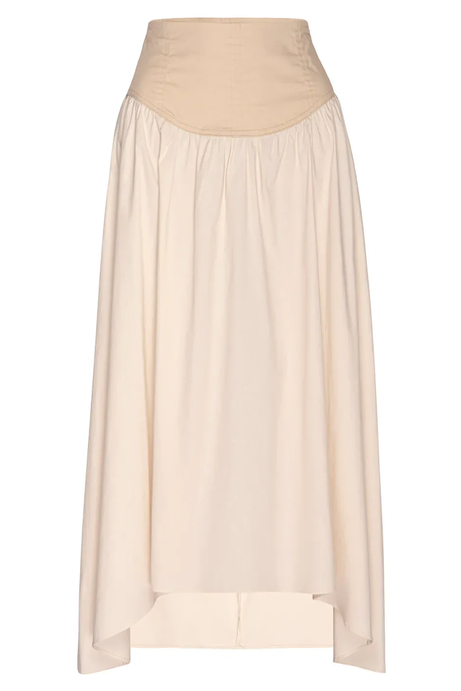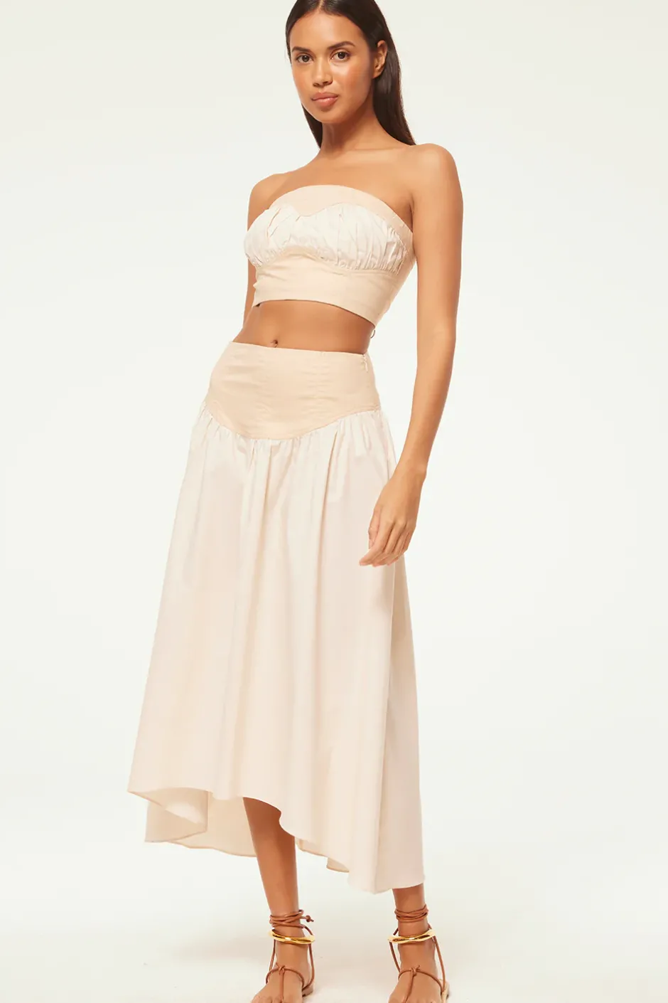 The Ramesh skirt is a midi length silhouette with a high-low hem, cut from a breezy cotton poplin in tonal beige and white. A curved wide banded waist offsets the flattering gathered skirt. Hidden side zip closure. Pair with the coordinating Golnaz bandeau for a chic summer set.
