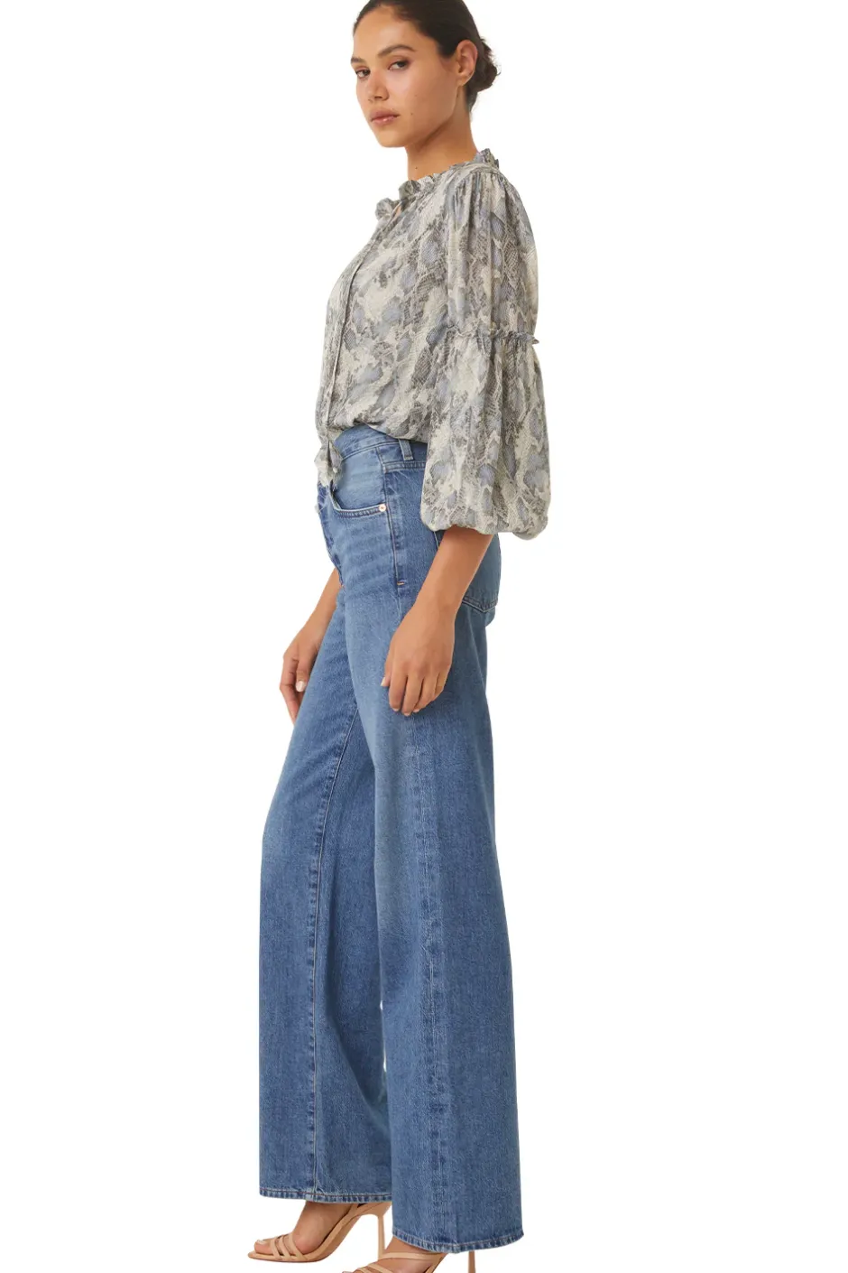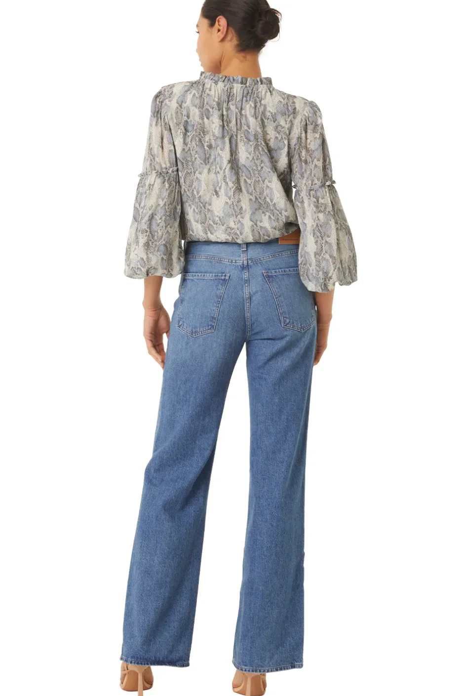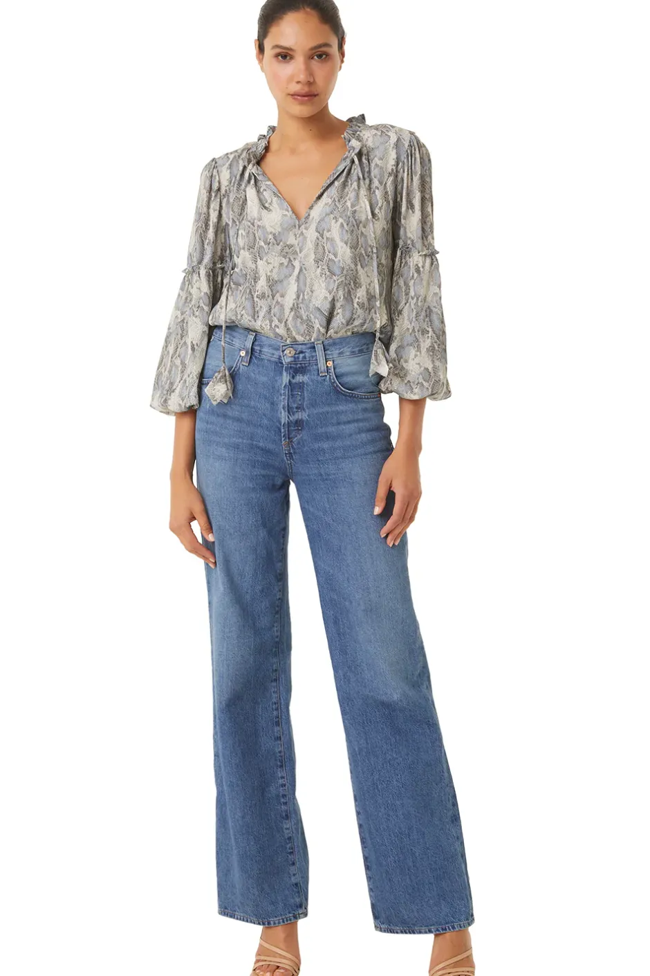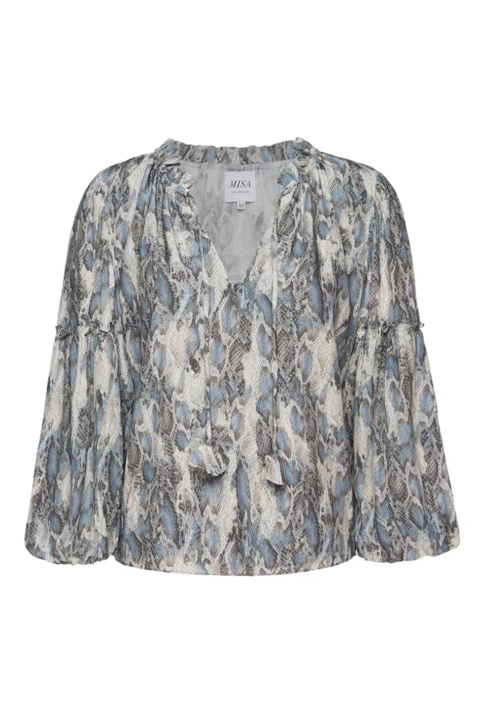 Renata is one of our new classic tops, handcrafted in a Spring python print viscose blend for a modern twist. A split-v neckline is completed with our signature petal ties. Long bell sleeves are cinched at the wrist to create volume. Pair with a tailored trouser or with baggy jeans for a chic and easy look.