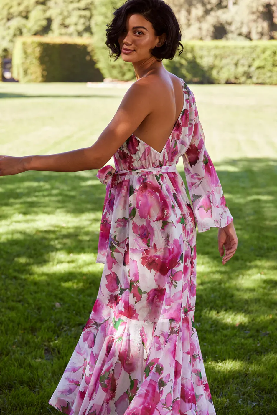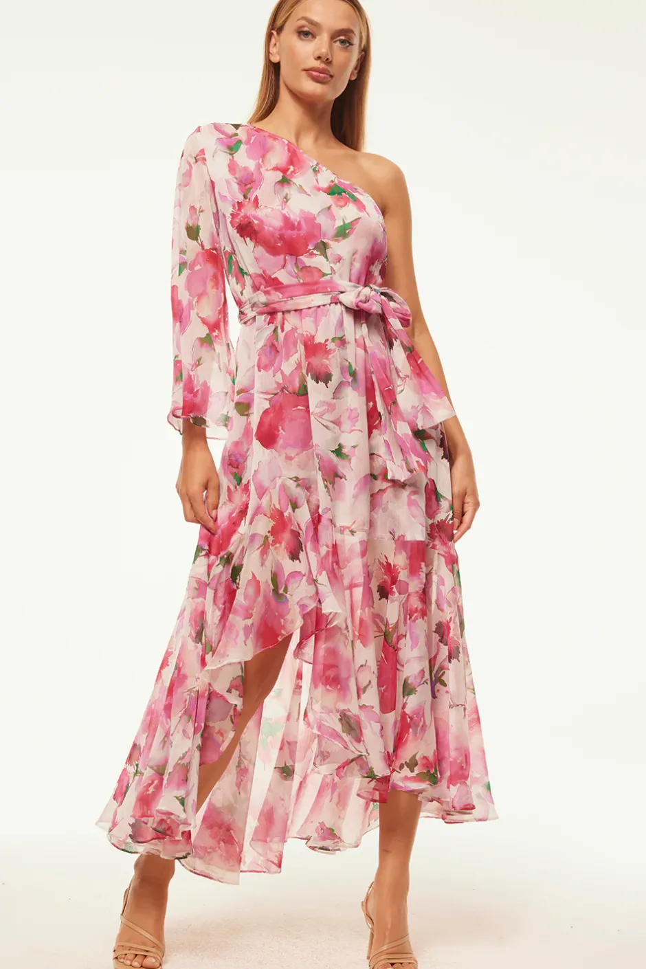 An effortless maxi silhouette combined with a sleek one-shoulder design make up this stunning dress. Handcrafted in a fuchsia floral chiffon, the billowing dress is decorated with a tie waist and features an asymmetric, floor-skimming skirt that moves gracefully with each step.