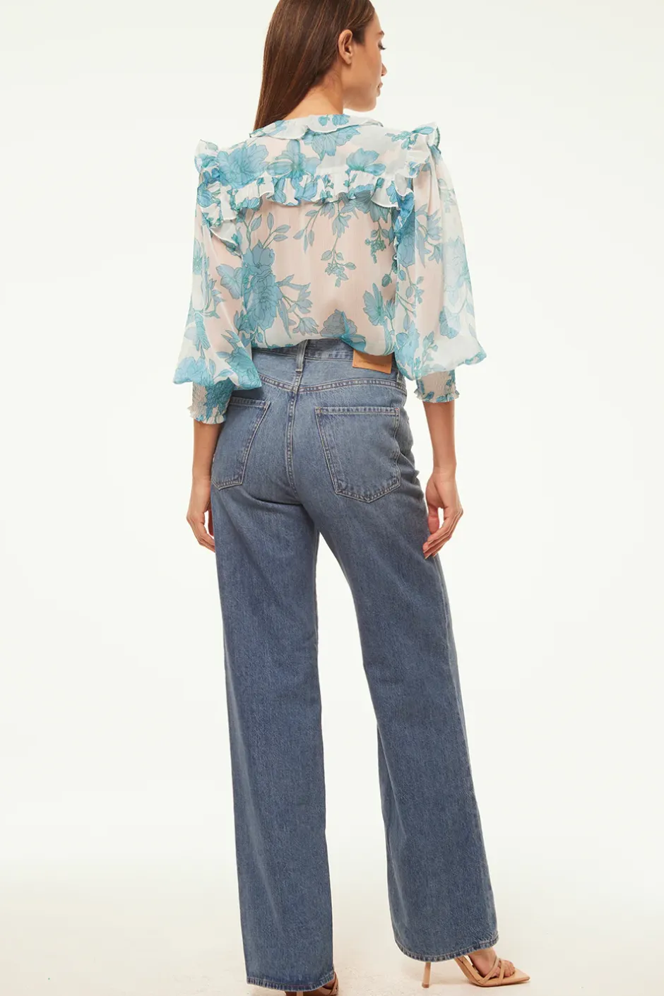 Sacha is an effortless, everyday blouse cut from a turquoise and white flora print chiffon. Featuring a v neckline and covered button front with ruffle trim to complement the chest pockets. Ruffle trimmed shoulders lead into a semi-sheer long sleeve with a wide-smocked cuff. Dress this easy style down with jeans or complete the set with our coordinating Marion skirt.