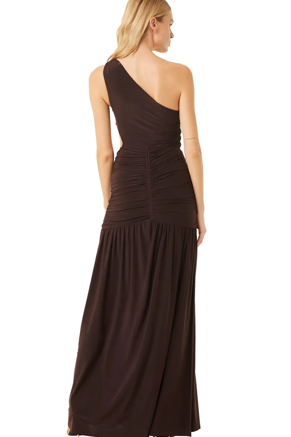 Samsara is our newest jersey silhouette in an on-trend espresso. Slipover style and maxi length. Featuring a ruched, cutout bodice and thigh-high side-slit, this one-shoulder silhouette is an easy option for every event on your holiday calendar.