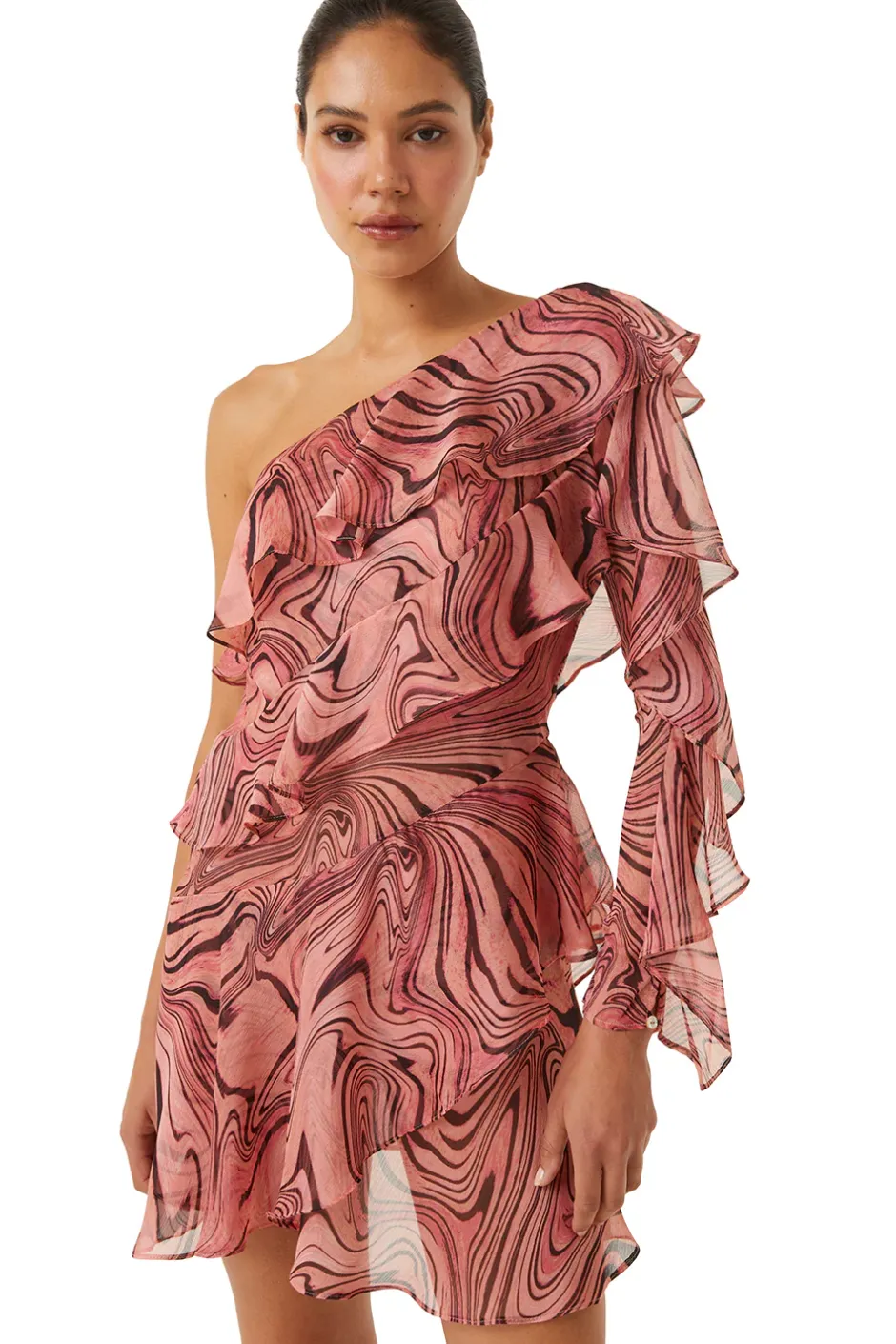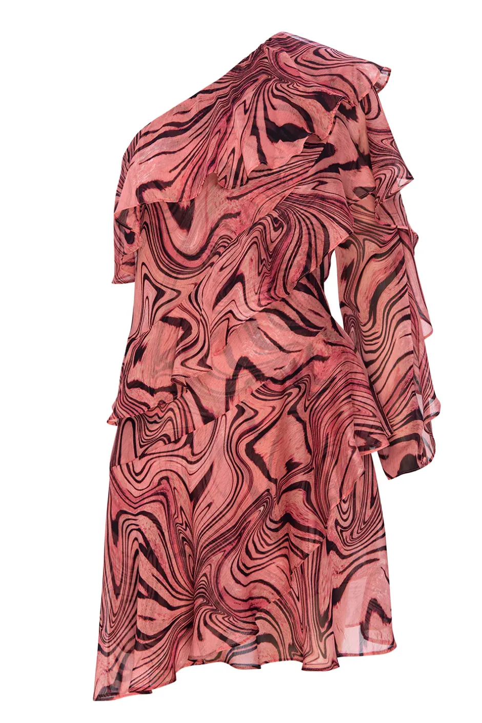 Cut from a beautiful dusty pink chiffon with a dark burgundy swirling woodgrain print, the Selena dress is a dreamy mini dress made up of airy tiered ruffles. This one shoulder silhouette leads into a long semi sheer sleeve with ruffle detail. The floaty skirt is made up of diagonally crossing ruffles for a beautiful effect. Pair this with a glittering heel for all your special moments.