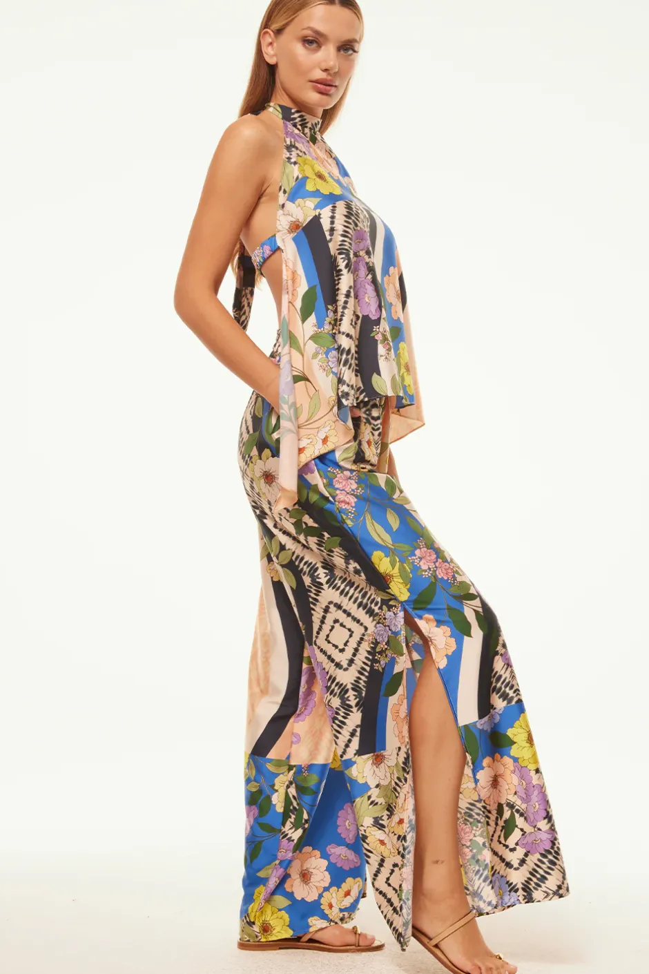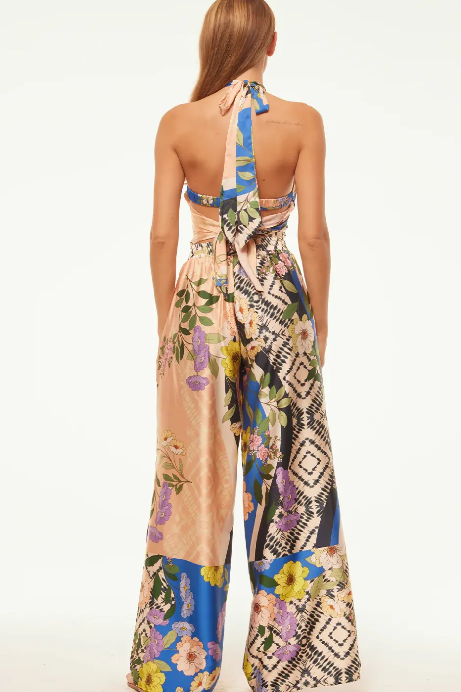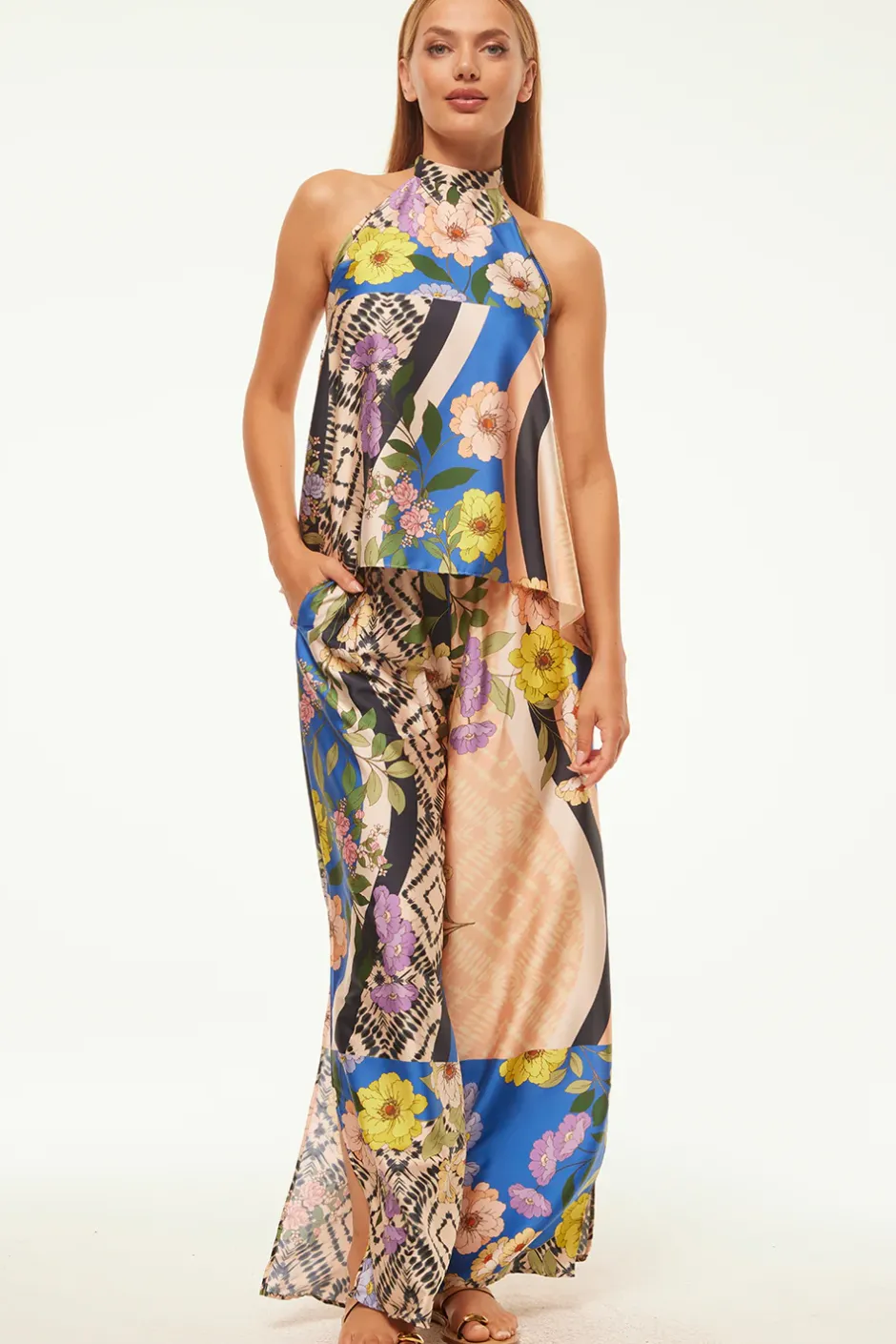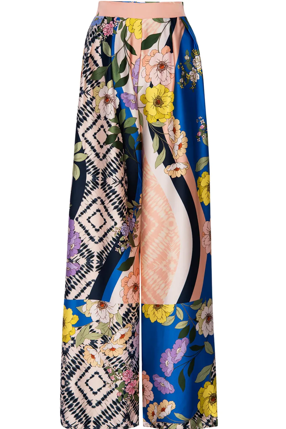 The Selena pant is cut from our gorgeous surrealism-inspired Lucid Dream print satin. Vivid blooms, stripes and tie-dye graphics adorn these wide leg pants featuring a flat band waist with elastic back for a comfortable fit. Double slide slit pockets. Two side slits at the mid calf add a chic touch. Style with the Ora top for a truly special set to take you through Spring and beyond.