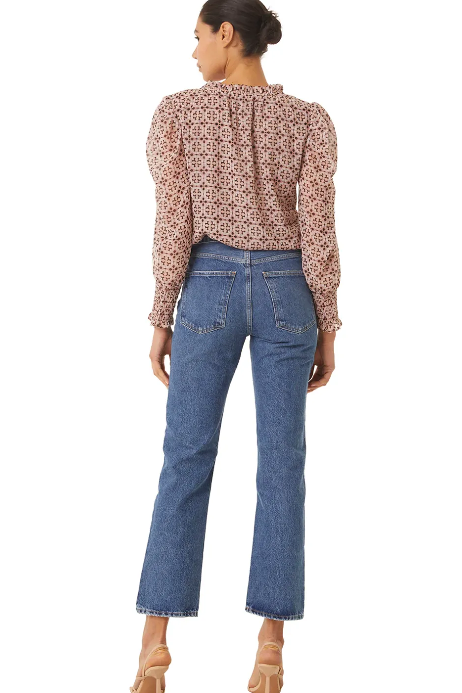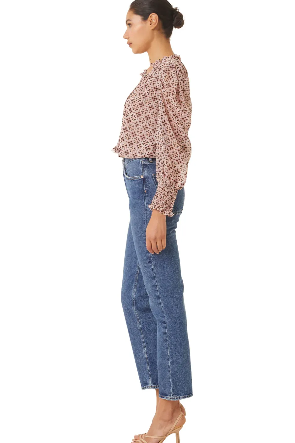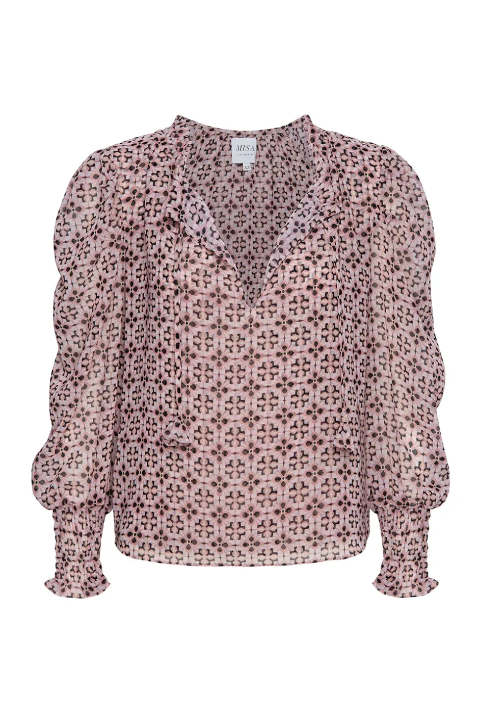 Our bestselling Siena top returns in a black and pale pink tile print chiffon. A split-tie neckline with ruffle trim and petal ties lead into long sleeves with wide, smocked elastic cuffs. Pair with your favorite jeans for a casual look.