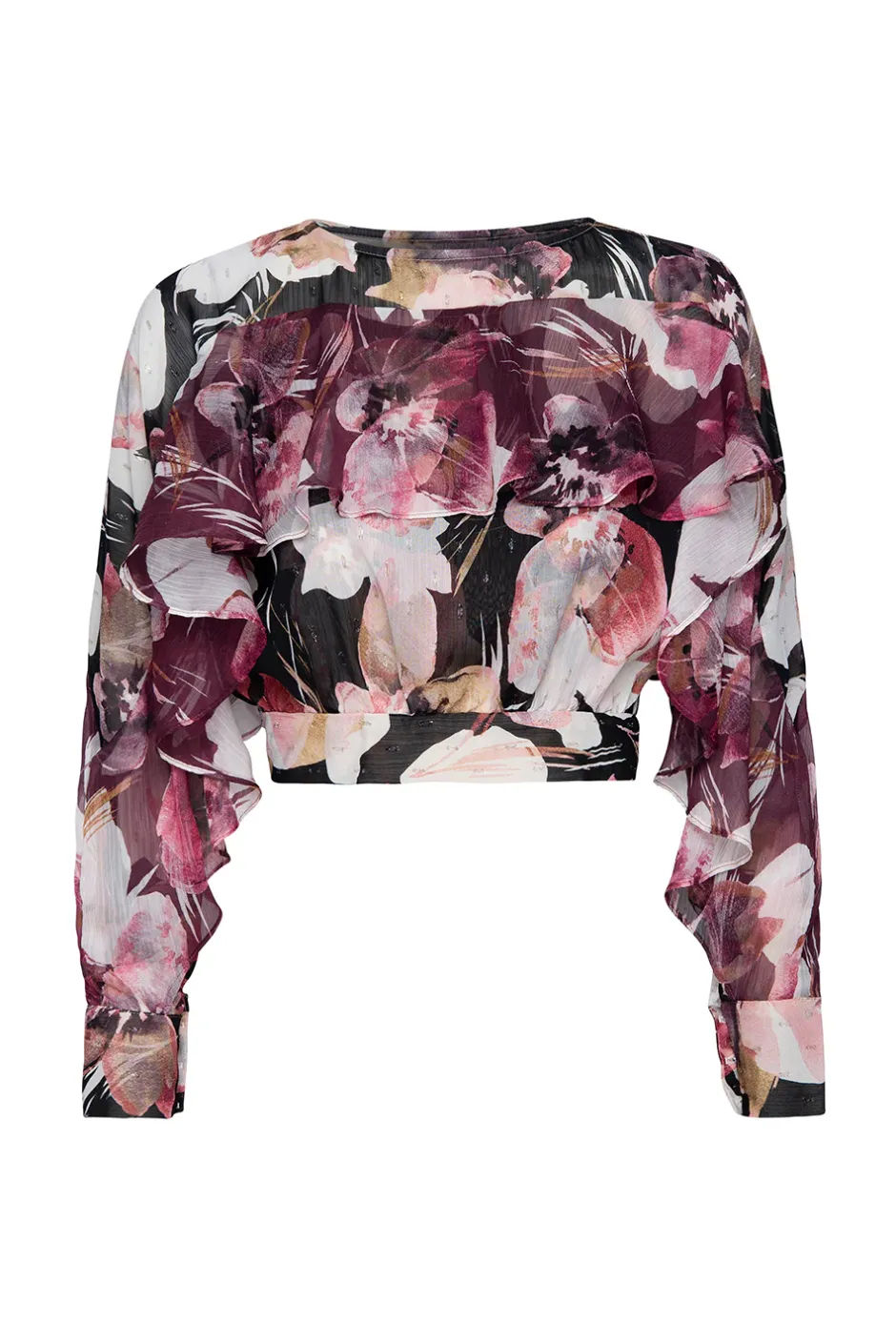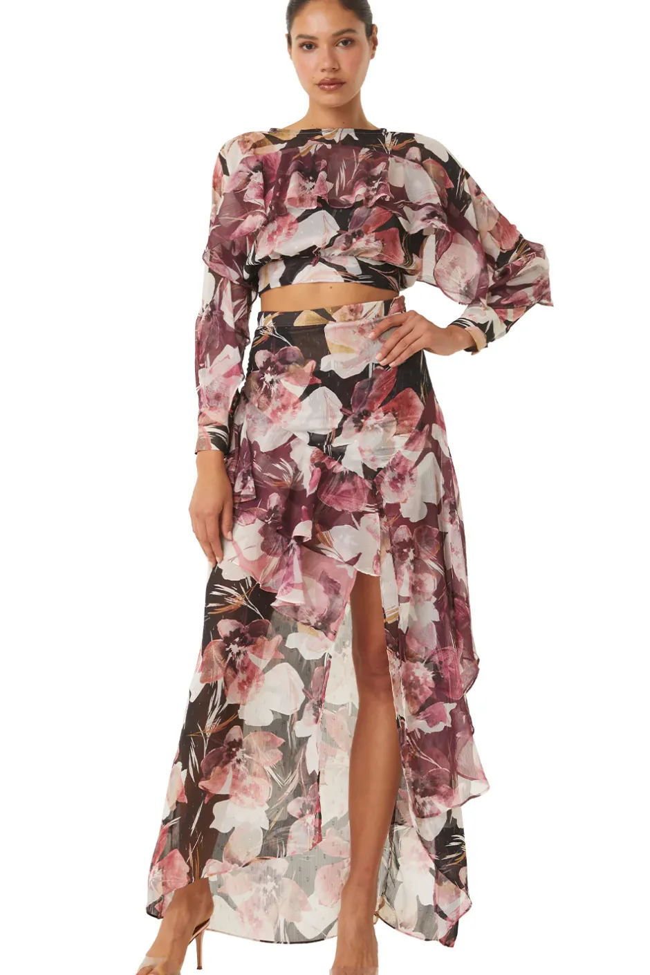 The Silvana top is a long-sleeve cropped top cut from a gorgeous Flora Tropical printed chiffon print with metallic flecks throughout. Double ruffles run across the bust line to the long sleeves. A double keyhole back button closure is finished off with a lovely tie. Pair with the matching Franca skirt for an ultra feminine ensemble or with the Sky skirt for a chic and sexy look.