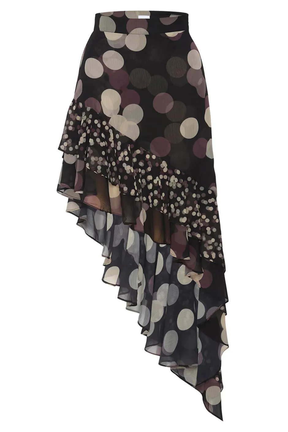 Our Sky skirt is a feminine mini with a twist. A dramatic asymmetrical double ruffle hem grazes the ankle. Cut from a large scale polka dot chiffon with a smaller scale polka dot print contrast ruffle. A hidden side zip closure. Pair with the coordinating Lulu top for the perfect party set.