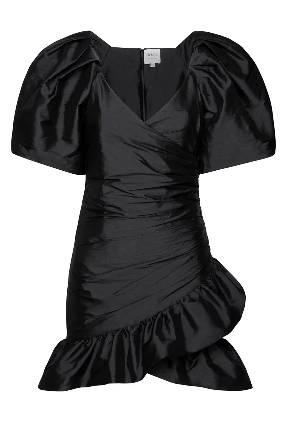 The Sybil dress is a festive mini dress cut from solid black taffeta. Embrace 80’s nostalgia with a voluminous statement sleeve detail and a cascading ruffle skirt bottom. Pair with a strappy heel for a show stopping holiday look.