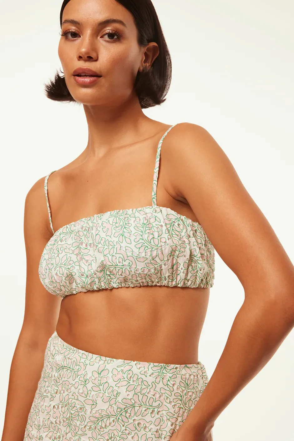 Teresa is a ruched lined bandeau top cut from our sweet Spring dewdrop eyelet cotton. Featuring adjustable spaghetti straps and a smocked back for a comfortable fit. Pull on style. Pair with the Antonella skirt.