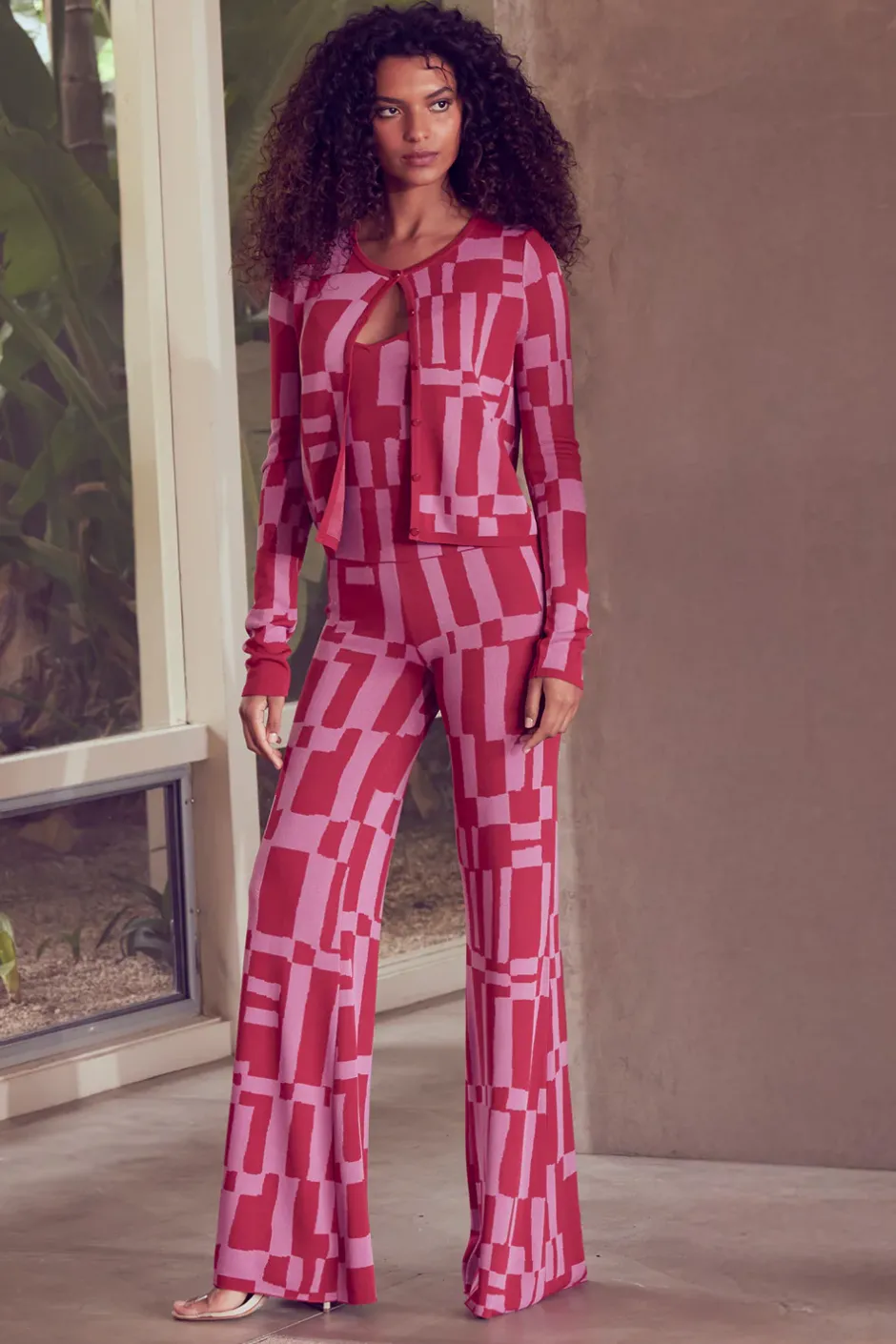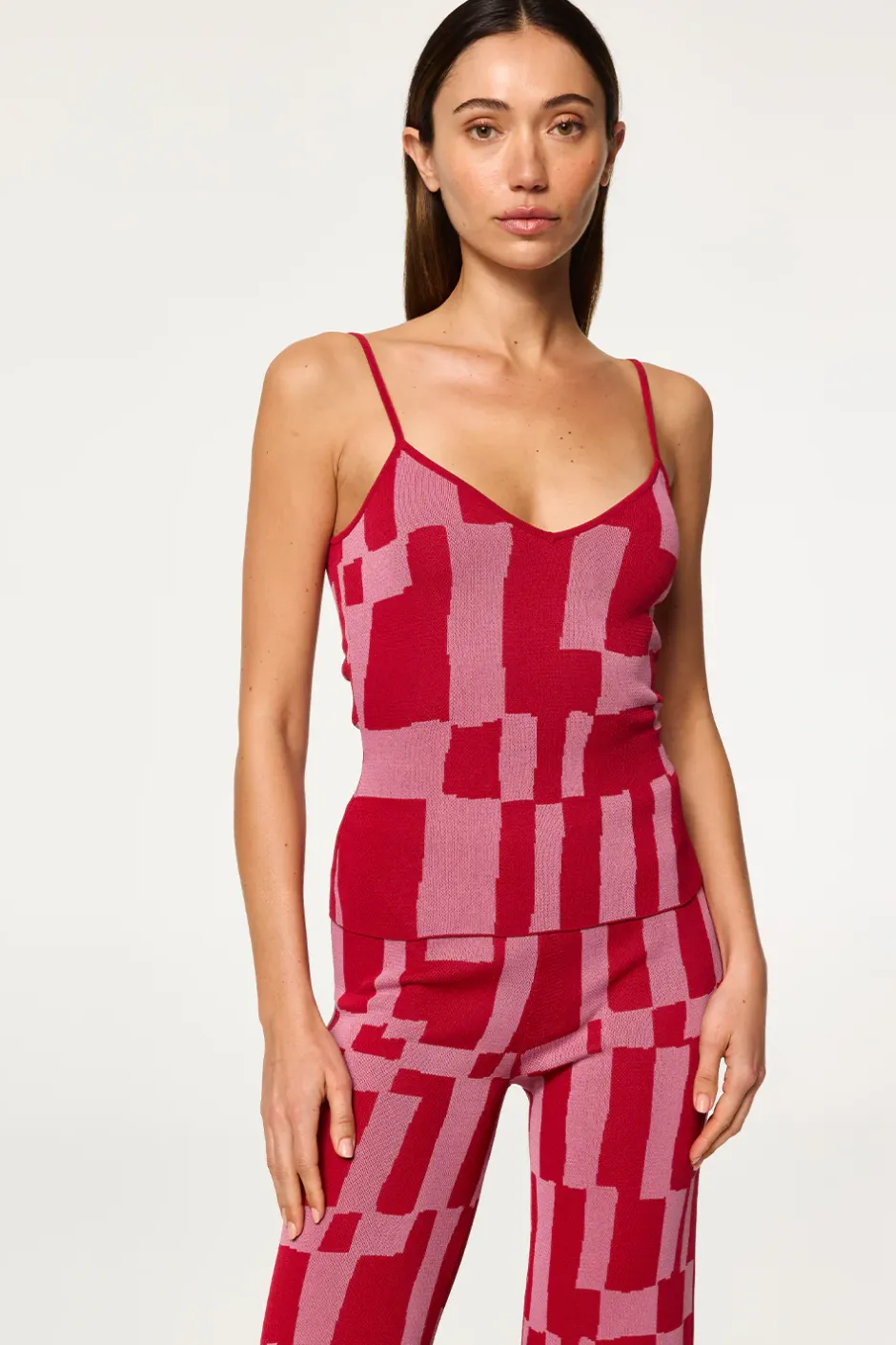 Our Una top is an easy layering piece in a vibrant knit geometric pattern. This stretch knit camisole features thin spaghetti straps and a scoop v neckline. Complete the set with the coordinating Elvin cardigan and Koa pant.