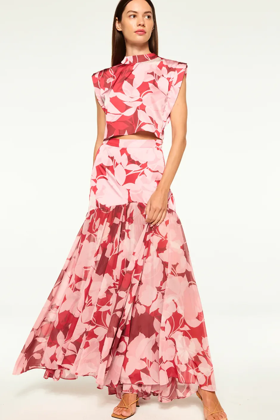 Stun in our all new Yara maxi skirt. This chic drop waist style features a fitted satin waist to the mid thigh where a curved hem meets a flowing double lined chiffon skirt in our eye-catching Flora Rosada print. A banded waist and hidden side zip closure. Complete the look with the coordinating Inah top.