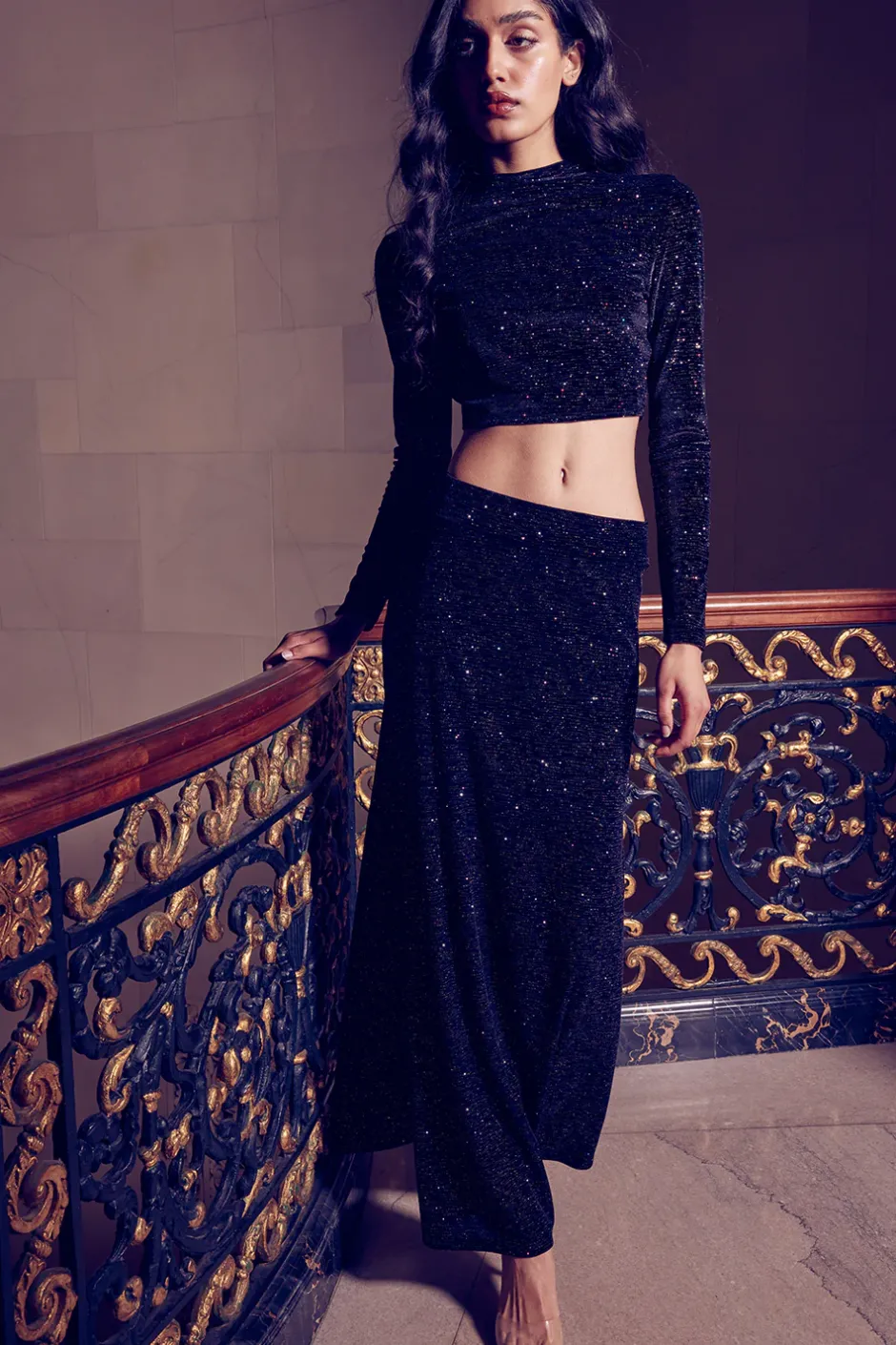 The Yasmine top is a figure-flattering cropped top cut from a glittering metallic knit fabric. Light up the night with celestial-like sparkles that will catch everyone’s attention. Pair with the matching Ekat maxi skirt for a chic, monochromatic evening look.
