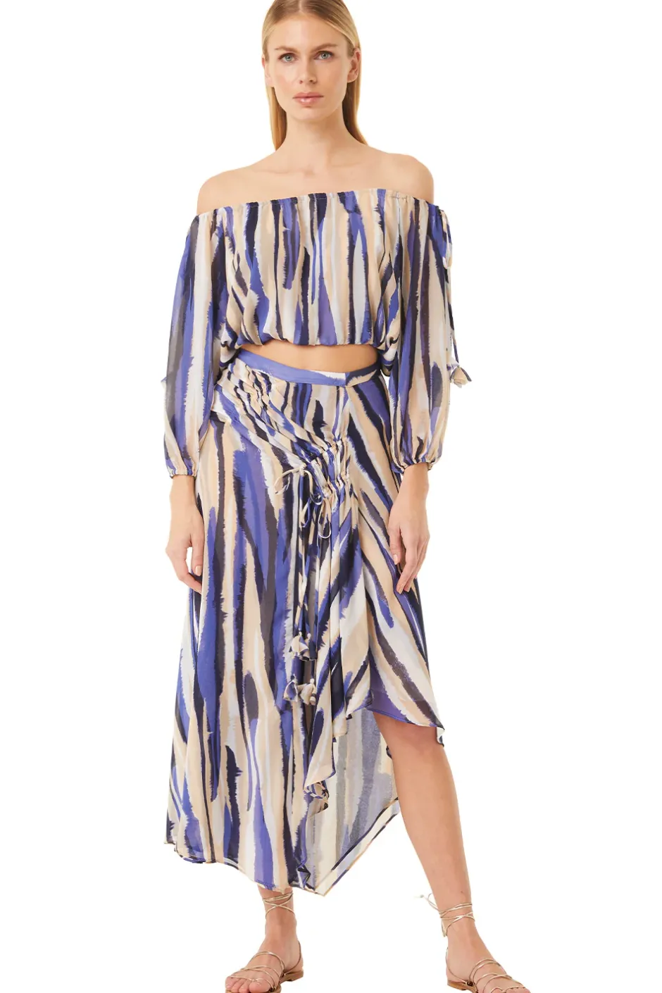 Zulika is a dazzling handkerchief style midi skirt with an adjustable cinched hip tie detail for the perfect asymmetrical look. Featuring a banded waist with hidden side zip. Pair with the coordinating Dalma top and a sleek sandal to complete the look.