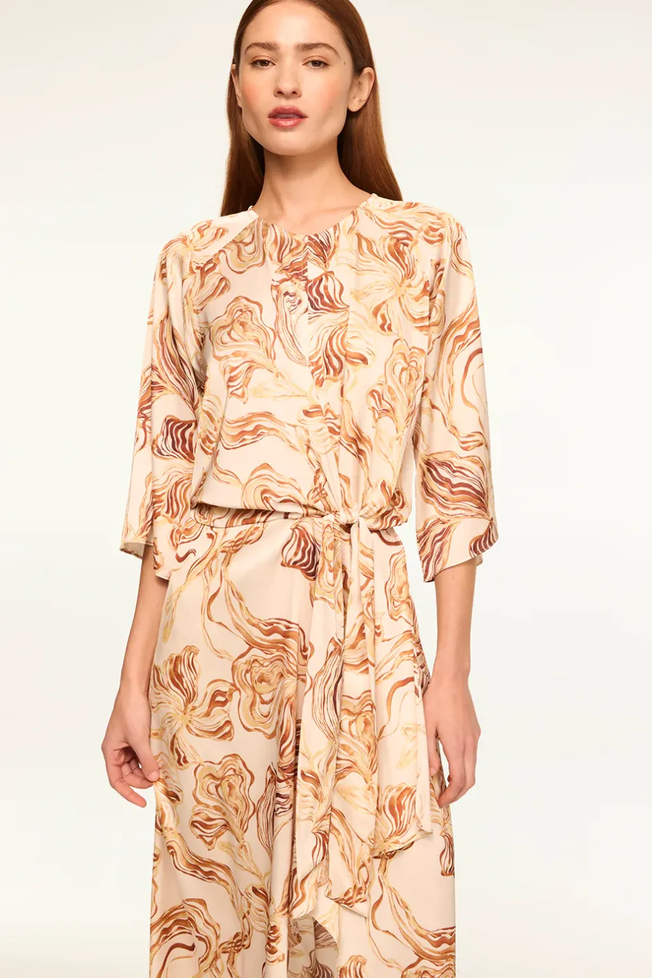 Our new Adina dress is a chic midi silhouette with three-quarter sleeves and a rounded neckline. Featuring a self-tie front that leads into a flattering faux wrap tulip skirt. Cut from our Golden Straw print satin, this style is the perfect desk to dinner look.