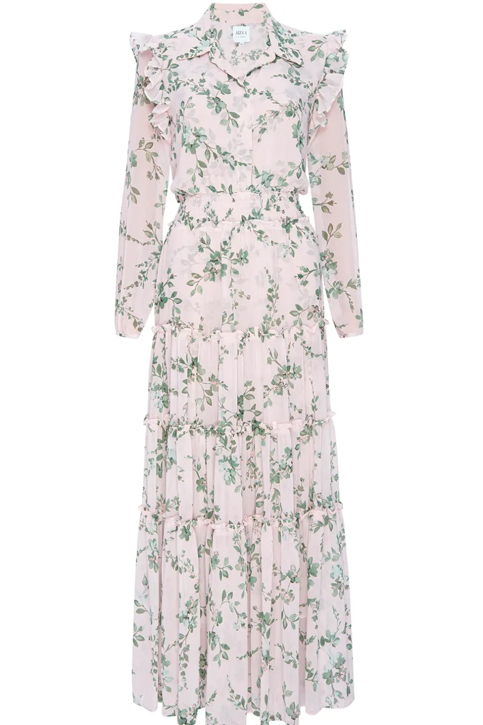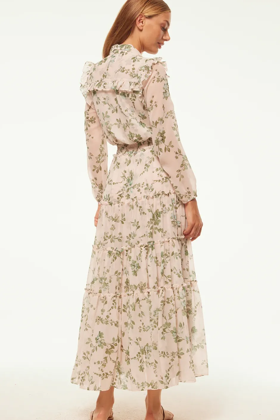 Our universally flattering Ahreana is back for Spring in a beautiful sage botanical print on a warm ivory chiffon ground. This feminine take on the shirt dress features a covered front button placket to the elasticated waist. A fold collar and delicate ruffle shoulder details lead into long semi-sheer sleeves. Back placket ruffle detail. The bodice and skirt are self-lined. The tiered ankle-grazing skirt finishes off this timeless style that can be dressed up with strappy heels or down with flats.