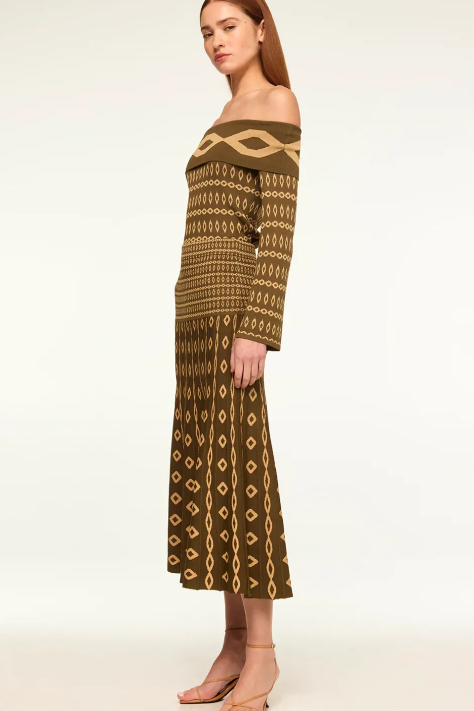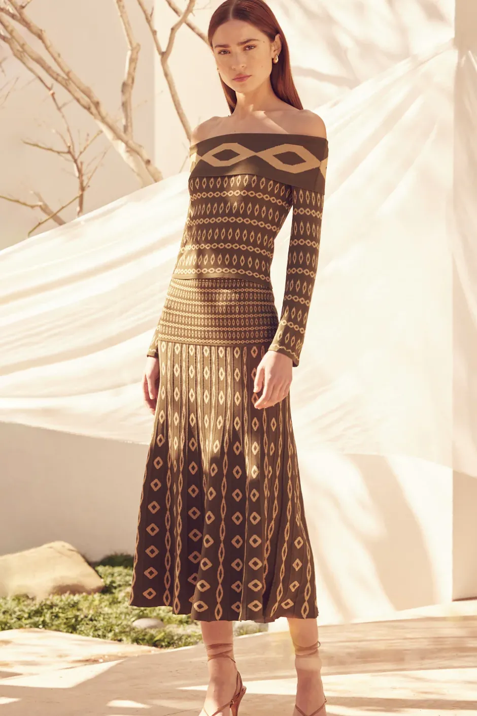 Our Alani knit top is an off-the-shoulder silhouette in a fitted rib knit geo printed jacquard. Featuring a fitted bodice and long, slightly flared sleeves. Pair with the coordinating Milani skirt for the perfect fall set.