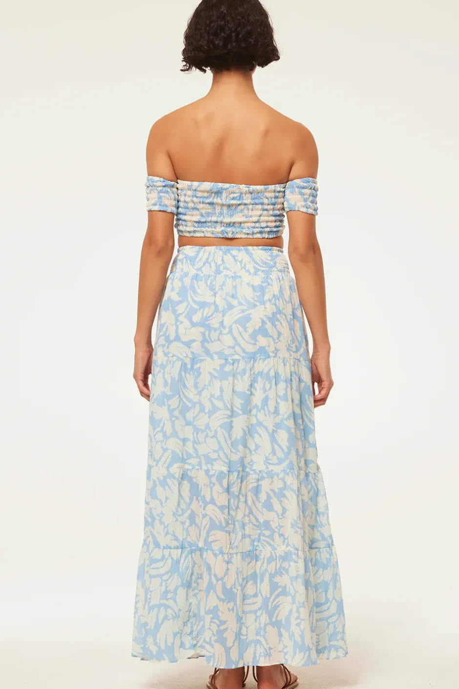 Our cropped Alba top is a smocked fitted bandeau with off-the-shoulder short sleeves. Cut in a sky blue printed cotton. Pair with the coordinating Yelena skirt for a set that is sure to turn heads.