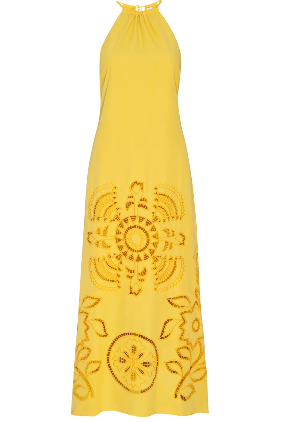 Alejandra is a chic and easy halter dress in vibrant canary yellow cotton. Featuring a beautiful floral hand embroidered eyelet design on the lower half of the dress and an adjustable tie neckline with back keyhole opening. Double lined. This timeless day dress is the perfect pack and go piece for all your weekend getaways.
