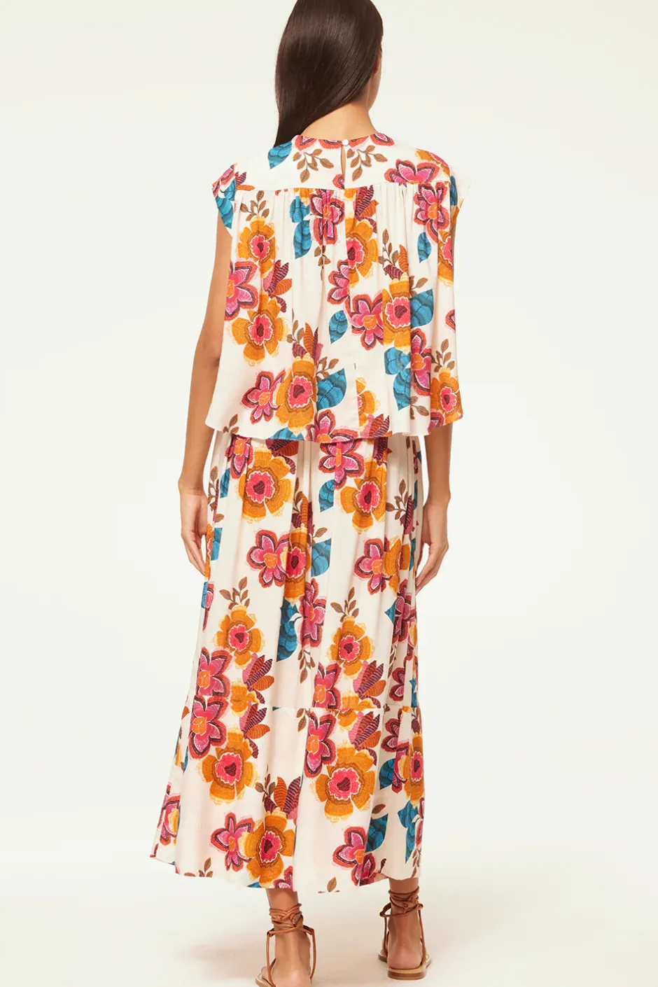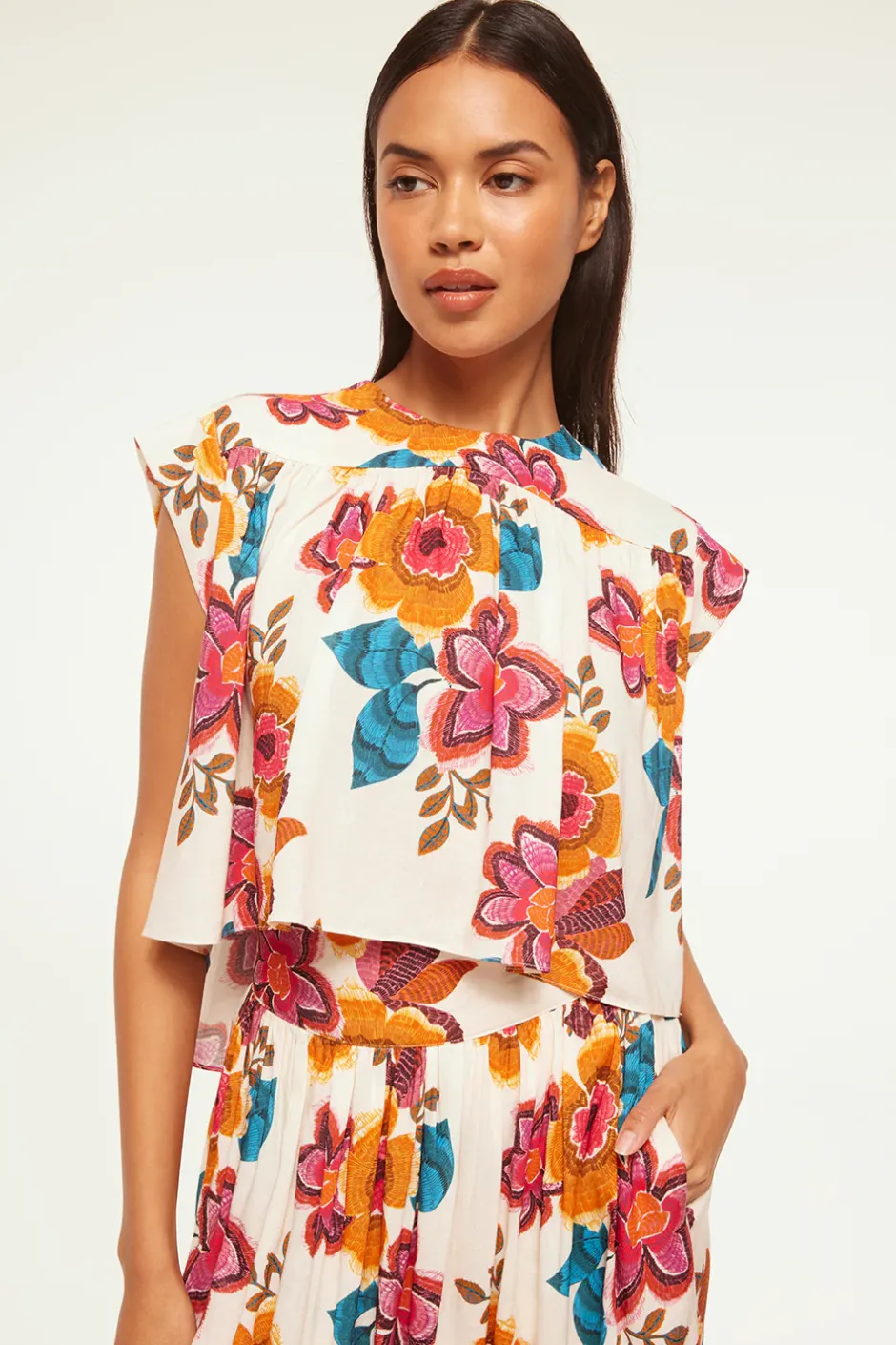 Alina is a new easy top cut from a vibrant Flora Marbella printed linen blend. This boxy shape features a high neckline and cap sleeves with a keyhole button back closure. The back hem is slightly longer. Pair with the coordinating Limor skirt for a sunny Summer set or with your favorite pair of jeans.