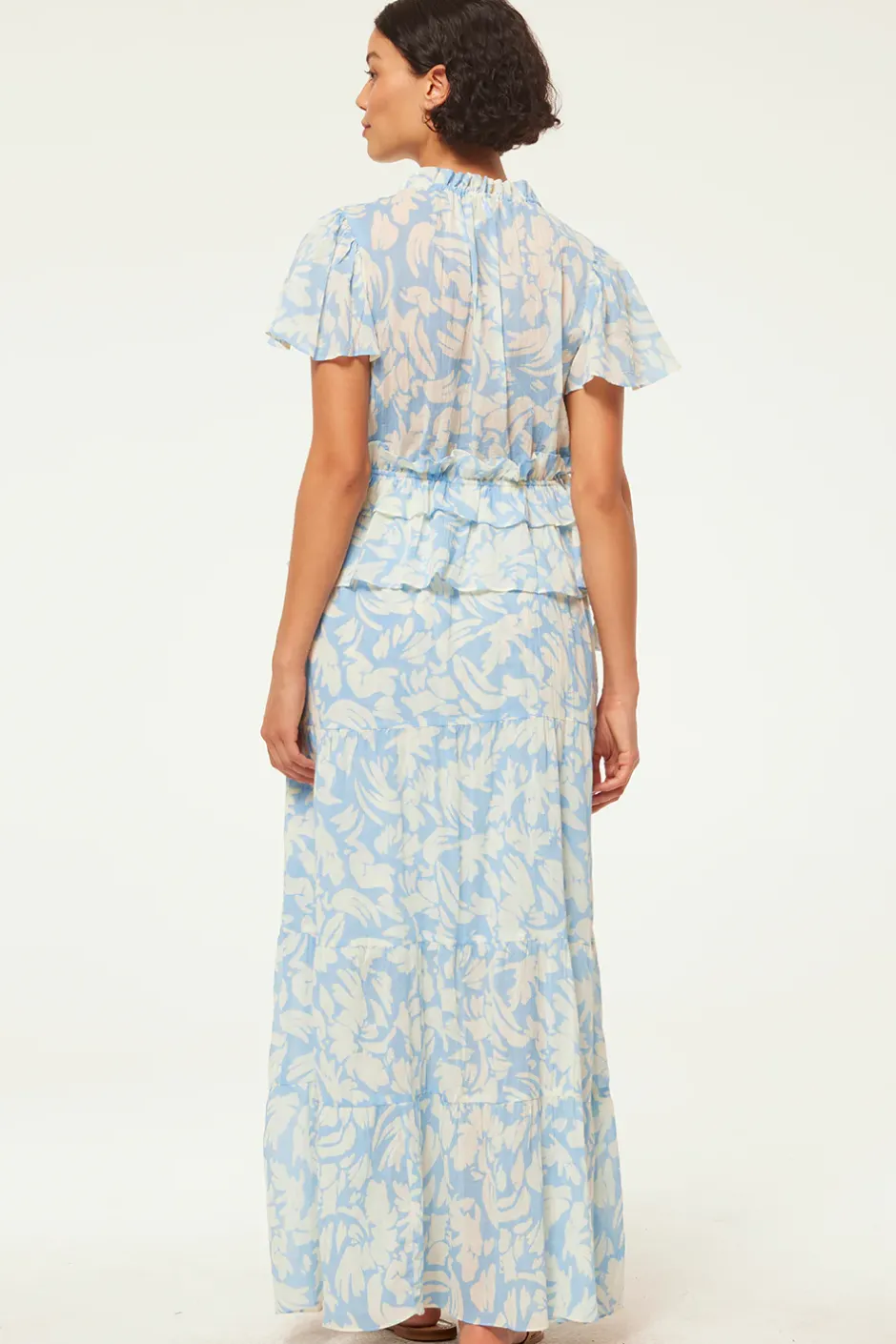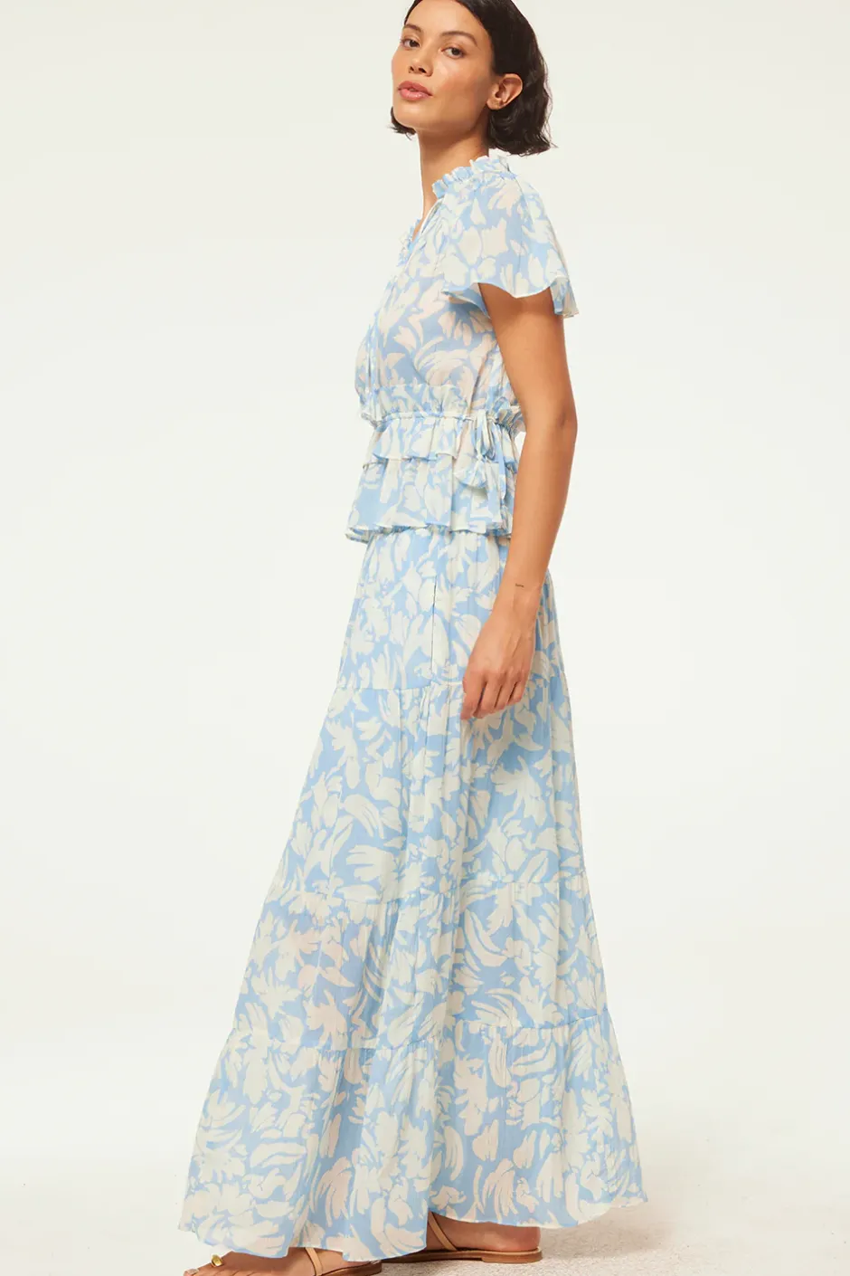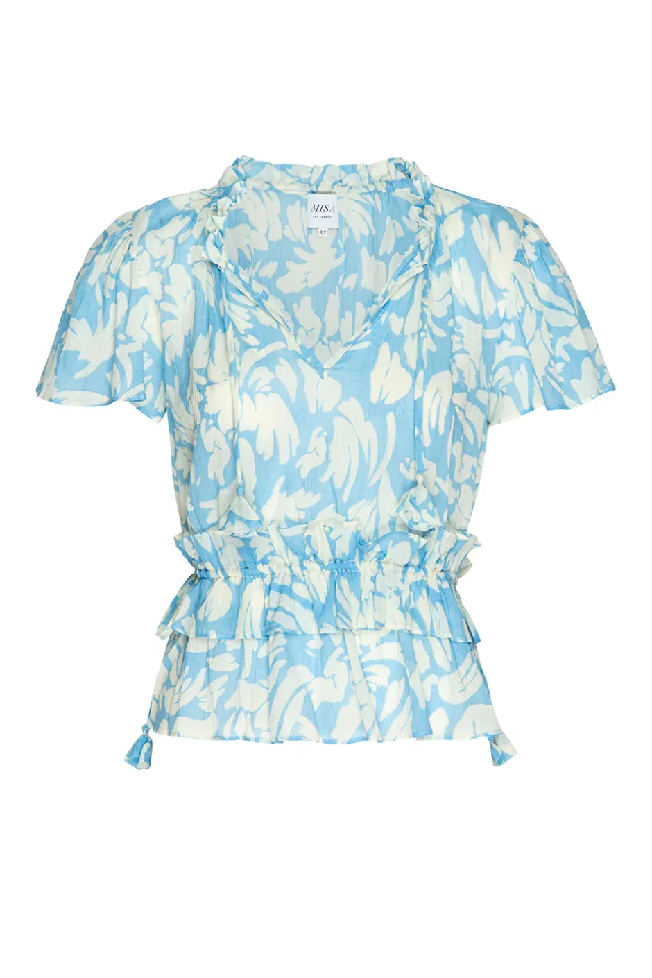 Our new Alisha top is cut from a gorgeous Patmos Sky cotton and features short flutter sleeves and a split v-neckline with adjustable petal tassel ties. A double ruffle peplum hem finishes off this easy blouse that pairs with everything from the coordinating Yelena maxi skirt to a pair of your favorite white denim.