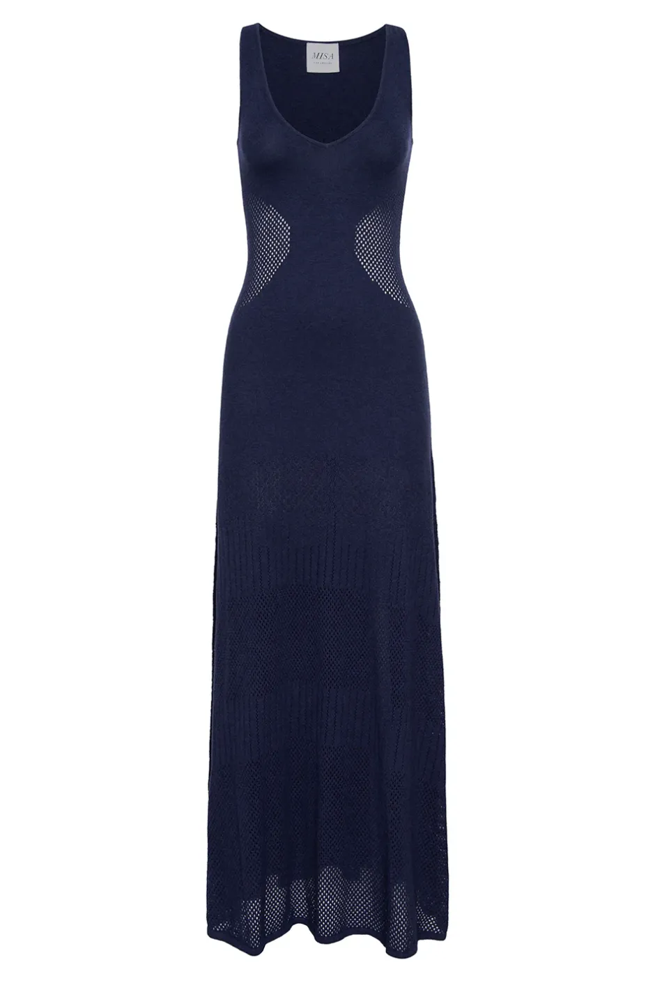 The Allison maxi knit dress is woven from the softest midnight blue cotton cashmere blend. This figure-hugging sleeveless silhouette features a v-neckline that leads into a solid body followed by bands of openwork crochet with a rolled hem. Pair with sandals for a beach ready look, or style with a sweater and boots for the cooler months.