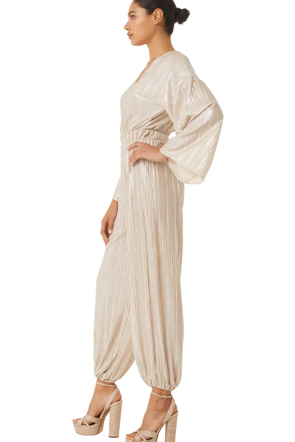 The Amina jumpsuit is a chic silhouette cut from glistening mother of pearl plissé. Featuring long, bell sleeves a deep v-neckline with hidden hook-and-eye closure, a smocked waist and open slit back with adjustable ties. The jogger style legs have side slits with elasticized ankle openings. Pair with heels for the perfect head turning event look.