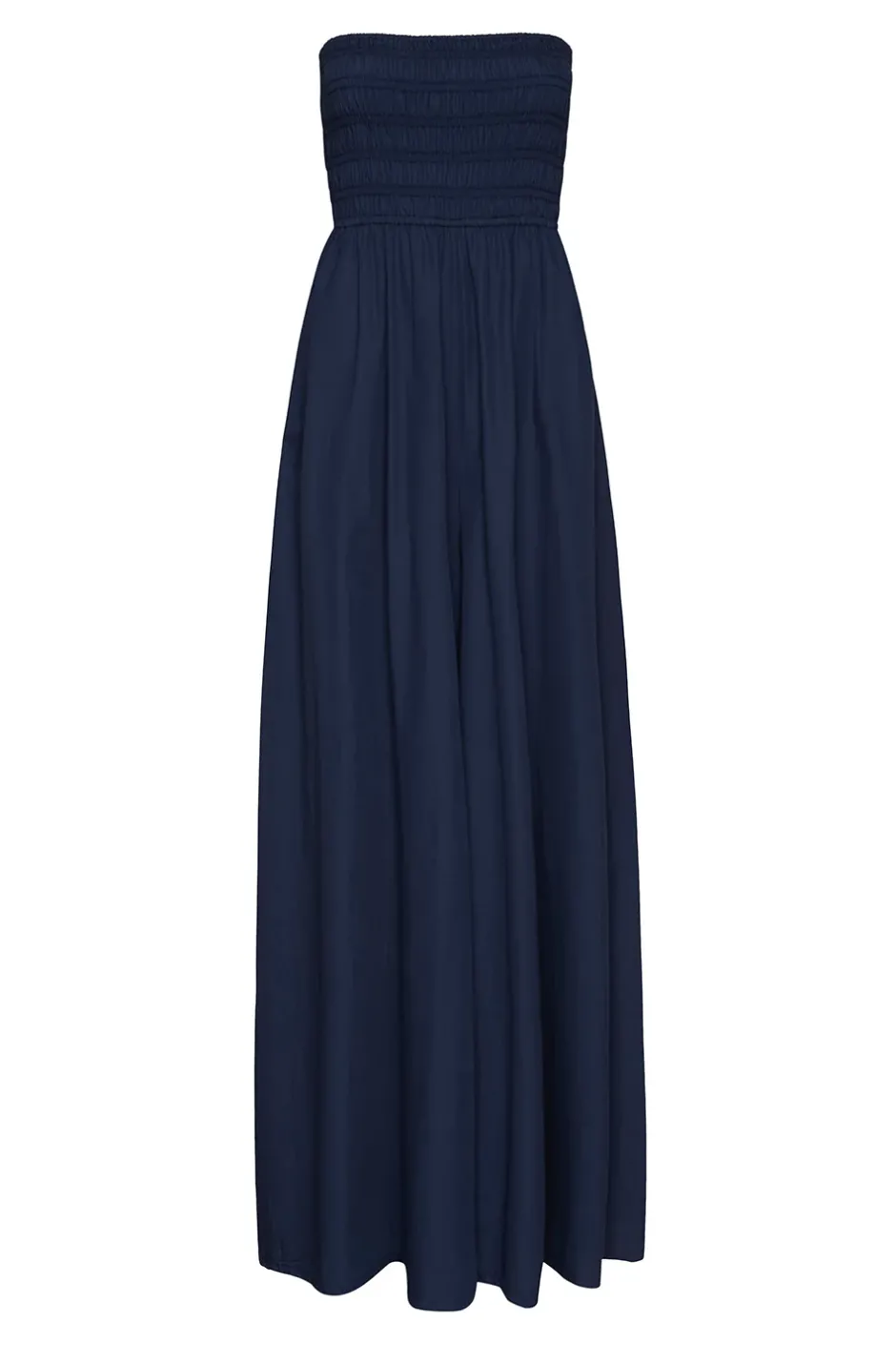 Andrea is a strapless wide leg jumpsuit cut from a lightweight midnight blue cotton poplin. A strapless smocked and ruched chest detailing provides support and effortless elegance. Side pocket details add in a layer of chicness and ease.