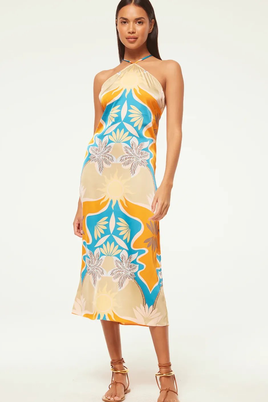 Our new Ashanti dress is a Summer standout cut from a gorgeous Bain de Soleil printed satin. This midi silhouette features a flattering halter neckline with a cross tie back closure. The perfect beach to bar piece for all your Summer moments.
