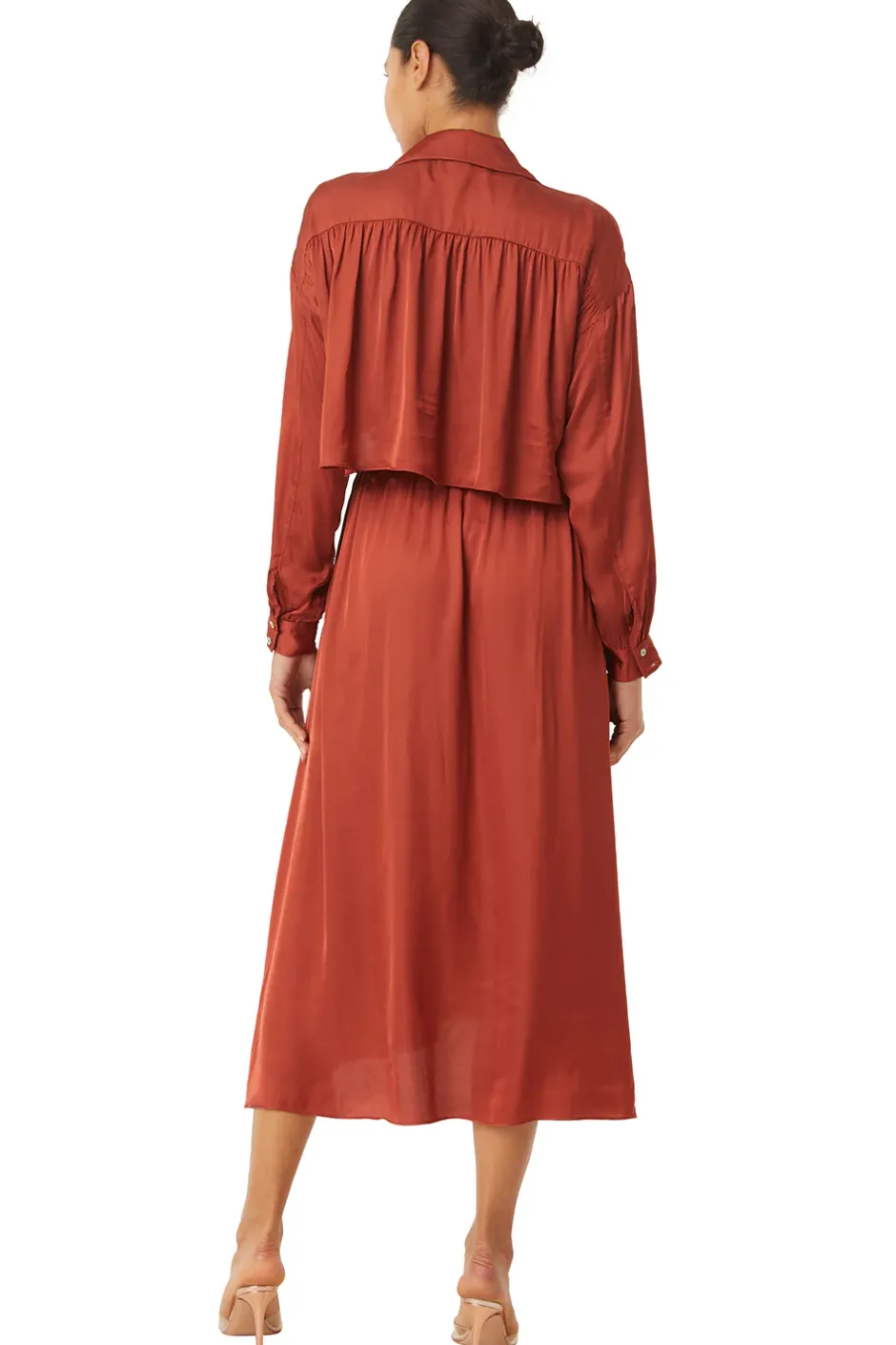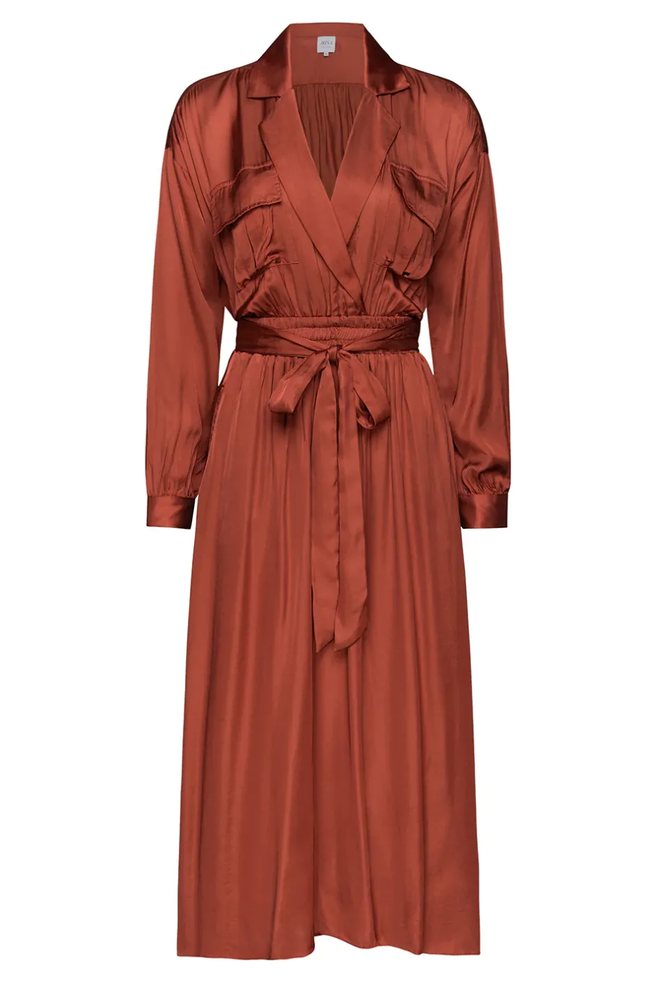 Warm things up with the Blair dress in a fluid burnt orange satin. This midi silhouette features a vented bodice with cargo pockets and a notched collar. Long sleeves with button cuffs. The flowing skirt features side slit pockets and a hem that falls below the knee. A v-neckline and and button closure with fold collar finish off this sophisticated style you’ll wear for years to come.
