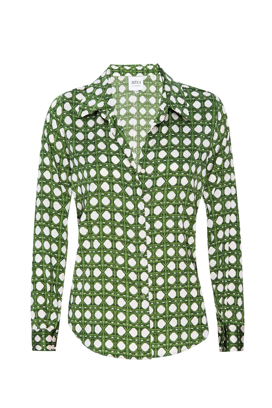 Our new Celine top is cut from a beautiful satin rattan print. An elevated version of your favorite shirt, this top features a fold over collar and covered buttons. Pair with the satin Rita pant for a coordinating standout set or with the Nico pant and Viva blazer in parchment for a chic Spring suiting look.