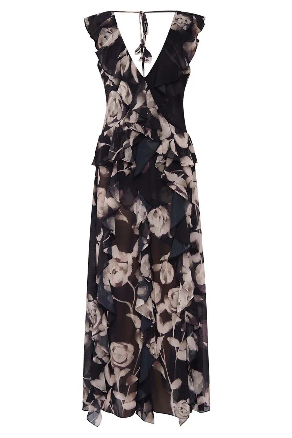 Our signature Claudita will make you feel like you are walking in a daydream with its feminine flair, escape into a world of ruffles in this elegant yet playful dress. Handcrafted in a chic faded rose chiffon, this standout style features a sleek v-neck with a cross-over ruffle at the top and cascading vertical ruffles through the maxi skirt. The open v back is finished off with our signature petal tassel ties. Throw the Joanne blazer over your shoulders for an elevated evening look.