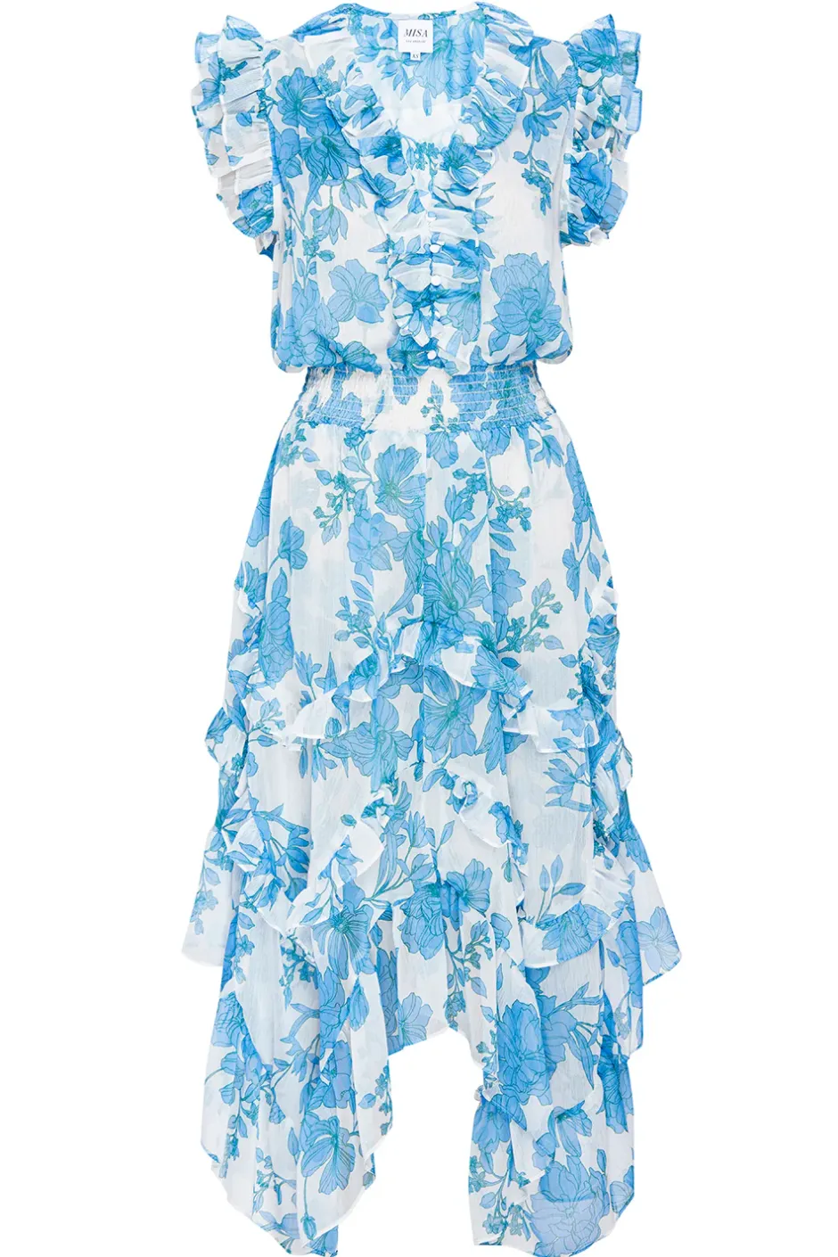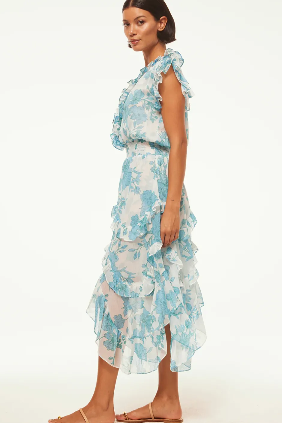 Chic and universally flattering, the best-selling Dakota is a playful yet elegant midi dress with stunning ruffles that take you from your desk to dinner any day of the week. Cut from a stunning turquoise floral print chiffon, this many-moment dress features a button v-neckline with a ruffle trim that compliments the sweet ruffle detail at the shoulders. A smocked elastic waist leads into a staggered ruffle trimmed hem.