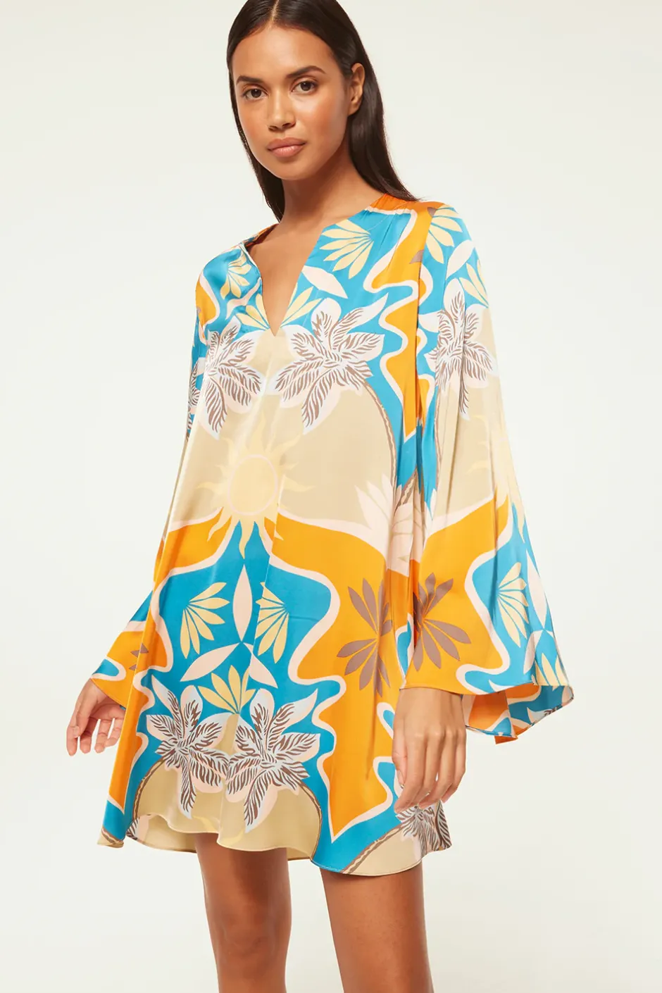 Our new Dusty satin tunic dress is an a-line mini that features a vibrant Bain de Soleil motif, a v-neckline and long flared sleeves. Can be worn with or without the self-tie belt. Pair this Summer-ready style with everything from flat sandals to an espadrille wedge.