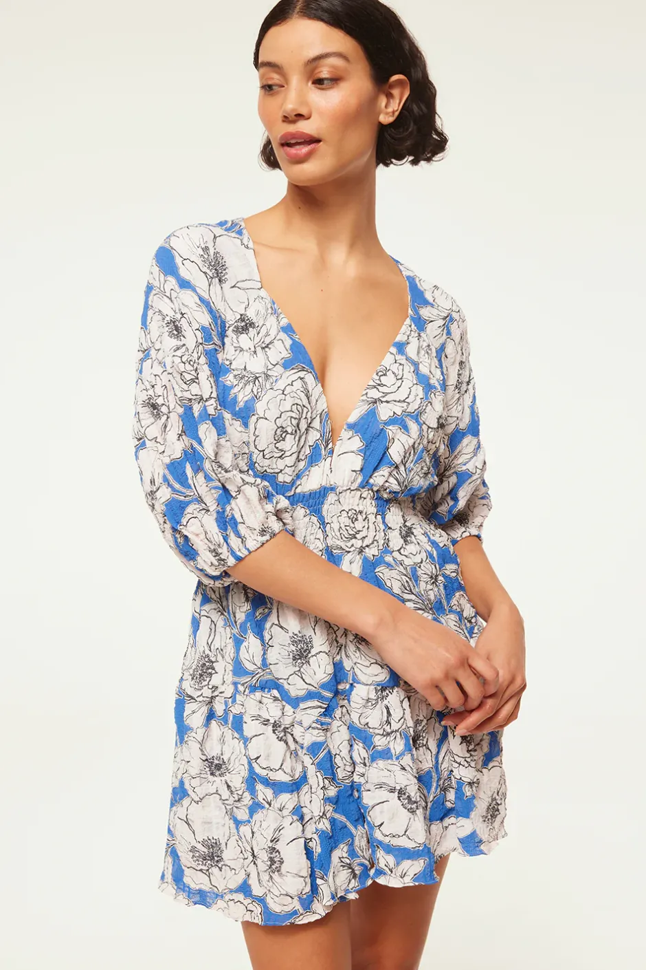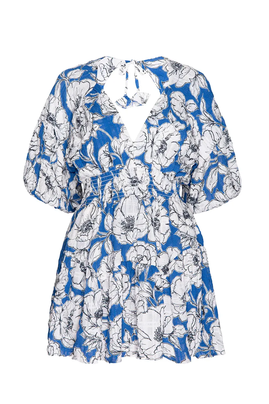 In a silhouette to suit all figures, our newest Eight dress stuns in a beautiful gardenia crinkle fabrication on blue ground. The deep v-neckline with hook-and-eye closure meets at the smocked elasticated waist and feature elbow-length voluminous sleeves while an open back features a self-tie closure. An effortlessly feminine style for this season and beyond.