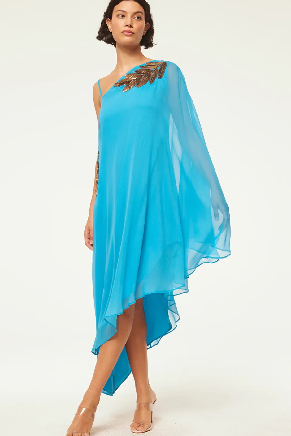 Elaneh is a standout Summer event dress cut from this season’s must have hue: Aqua. This one shoulder silhouette features a dreamy sheer chiffon draped sleeve and an adjustable spaghetti strap on the other shoulder. Palm D’Or beaded appliques adorn the shoulder and waist for an elevated detail. An asymmetrical hem hits at the ankle at the longest point. Double layered.