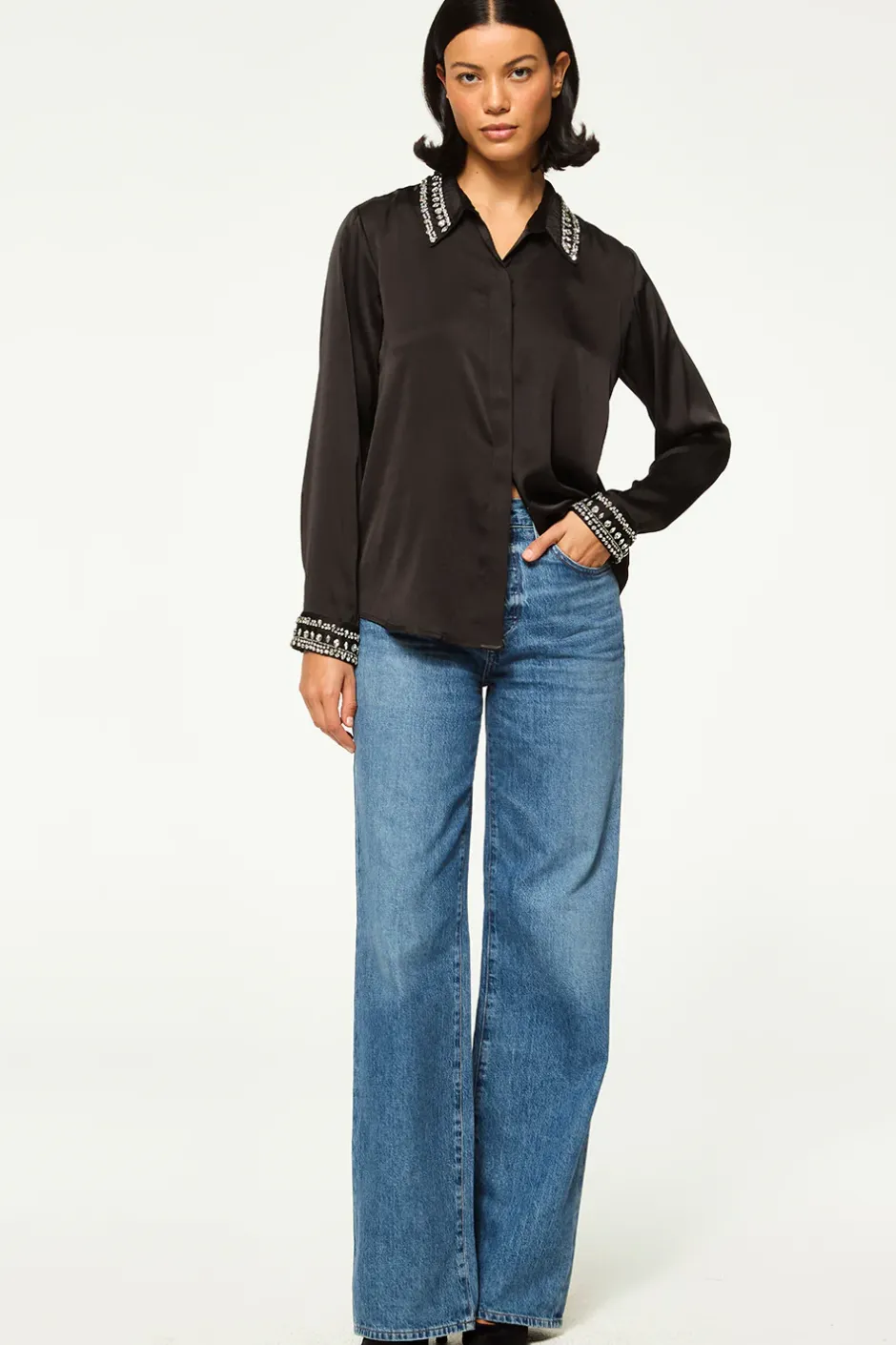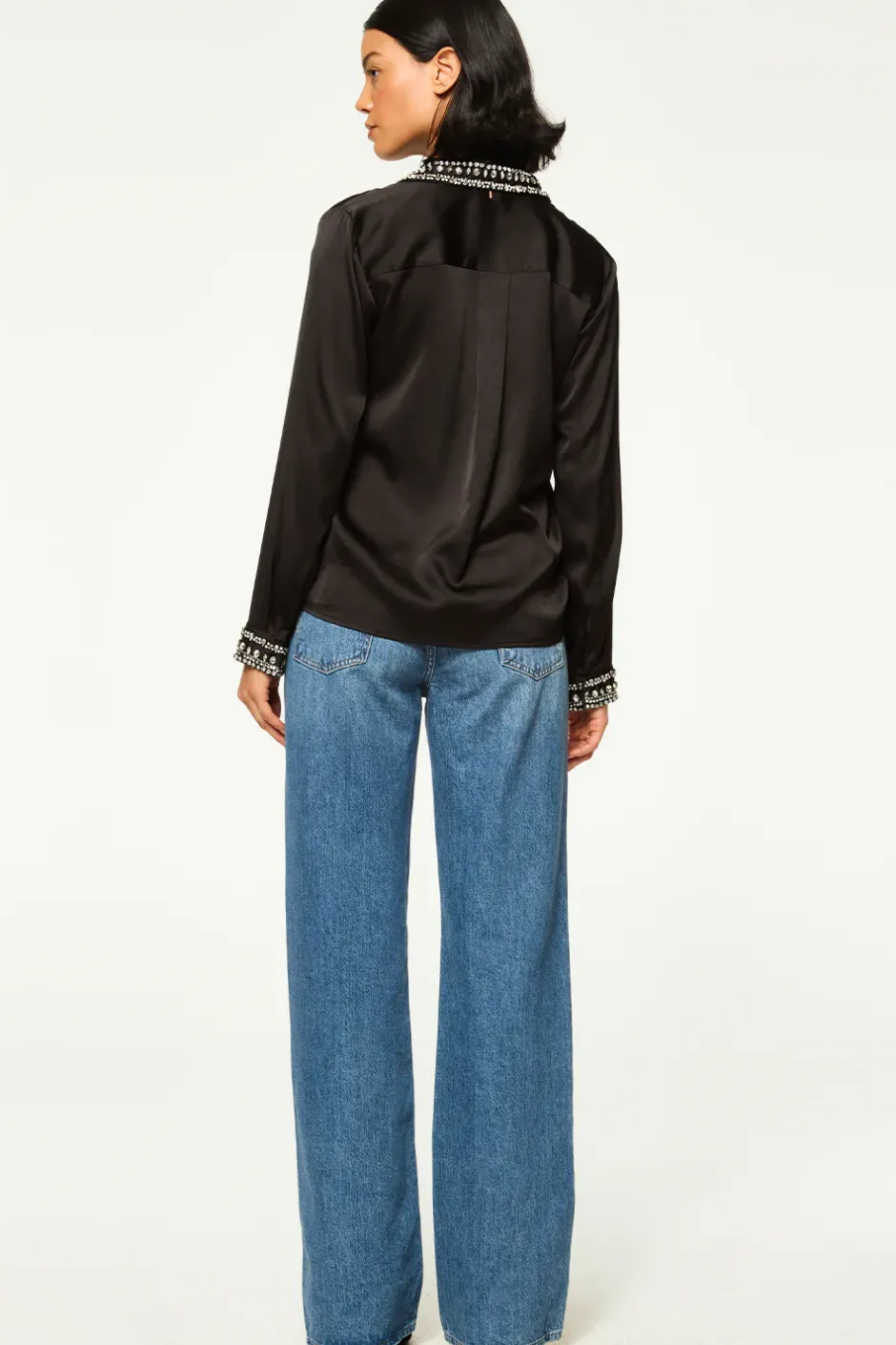 Ellie is a chic holiday update to your favorite button down shirt. Featuring a rhinestone embellished collar and cuffs. Cut from black satin with a full hidden button front placket. Dress up your favorite pair of jeans or wear with our coordinating Leia satin pant for a stunning holiday set.